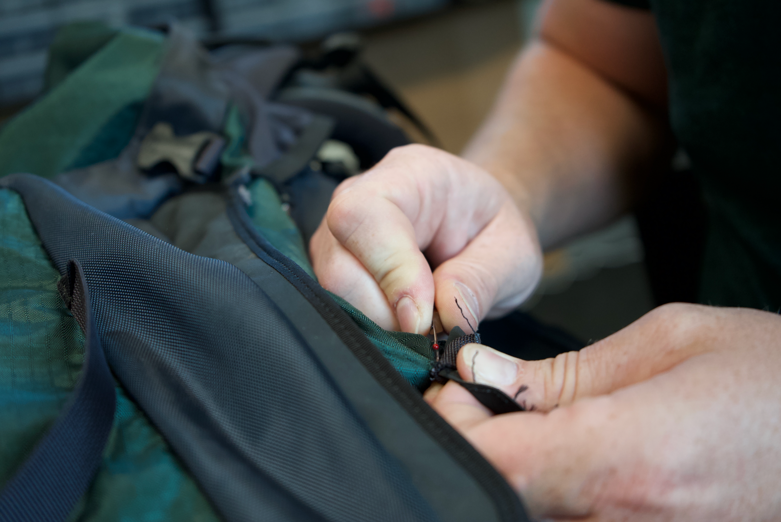 We wanted to cut off a lot of the weight that was on the top of the Baltoro. In order to do that we needed to replace the top closure with a 0.8 oz Dyneema® Composite Fabric roll top closer. (We used an UL Side Release Buckle and 1/2" Nylon Grosgrain.)