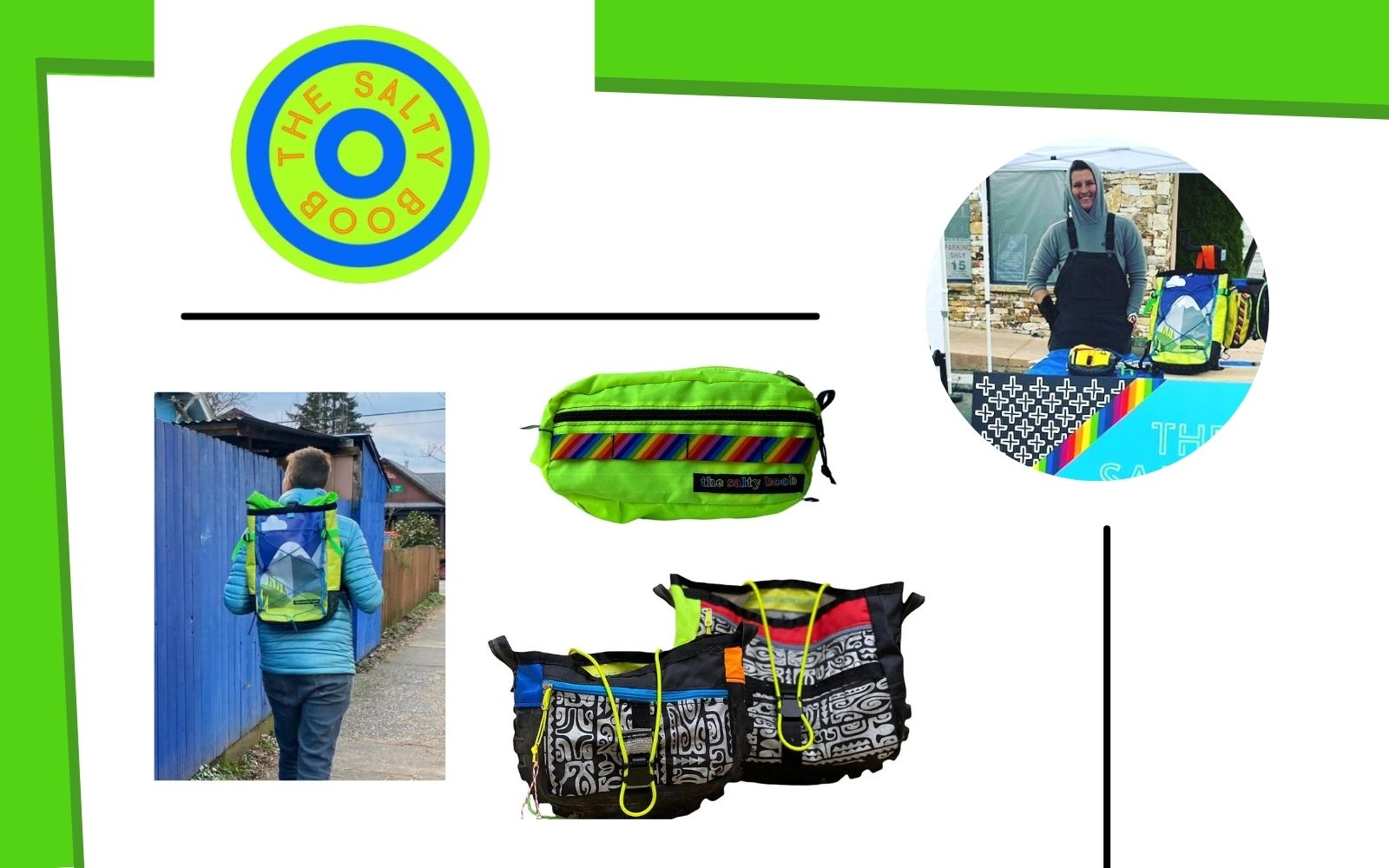 What type of gear do you make? The Salty Boob makes a backpacks, bike packs, Fanny packs, bike baskets and more; using mostly repurposed materials, like kitesurfing kites, bike tires (yessss tires not the tubes), vinyl banners, etc!