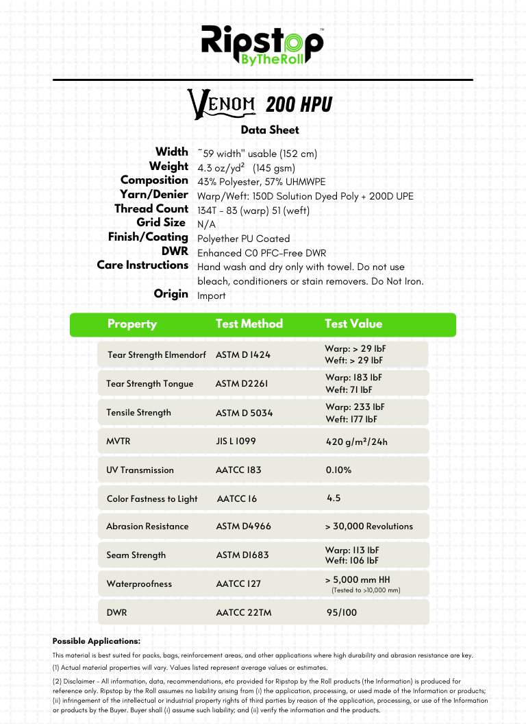 (2) Disclaimer - All information, data, recommendations, etc provided for Ripstop by the Roll products (the Information) is produced for reference only. Ripstop by the Roll assumes no liability arising from (i) the application, processing, or use made of the Information or products; (ii) infringement of the intellectual or industrial property rights of third parties by reason of the application, processing, or use of the Information or products by the Buyer. Buyer shall (i) assume such liability; and (ii) verify the information and the products.