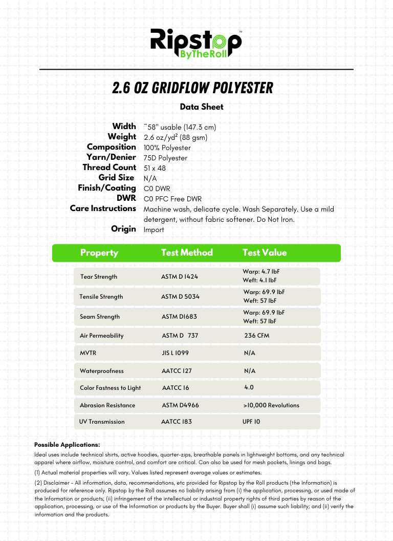 2.6 oz GridFlow ™ Polyester is a unique performance apparel fabric engineered for makers who demand comfort, airflow, and versatility. Constructed from 100% moisture-wicking polyester, GridFlow dries quickly, breathes exceptionally well, and delivers reliable comfort during sustained movement—making it ideal for ultralight apparel where heat and moisture management matter most.