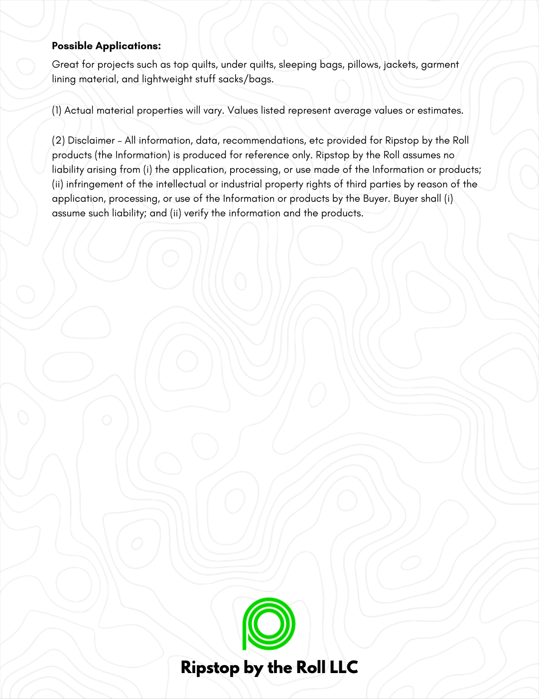 (2) Disclaimer - All information, data, recommendations, etc provided for Ripstop by the Roll products (the Information) is produced for reference only. Ripstop by the Roll assumes no liability arising from (i) the application, processing, or use made of the Information or products; (ii) infringement of the intellectual or industrial property rights of third parties by reason of the application, processing, or use of the Information or products by the Buyer. Buyer shall (i) assume such liability; and (ii) verify the information and the products.