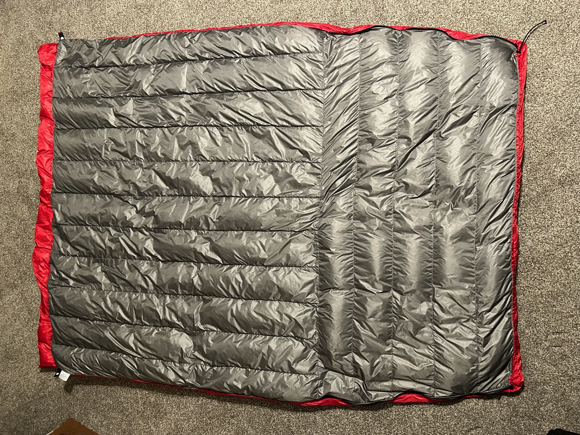 This summer I made my wife a hammock. She sleeps cold so wanted a very warm quilt set. This is my third quilt and my answer to her request. She hates having her feet confined so I made it a zippered footbox. I also used the Catsplat calculator to determine the comfort rating and hope the 900 FP HyperDry down will do the trick to keep her warm in the spring and fall weather I'll take her out in. I zeroed the scale with my dry bag and the quilt weight came in at 1lb 6.75 oz. I learned quite a bit and I'm proud enough of this to get some labels printed and put my name on it. I still have a lot of improvements to make but I hope each one get's better. Â