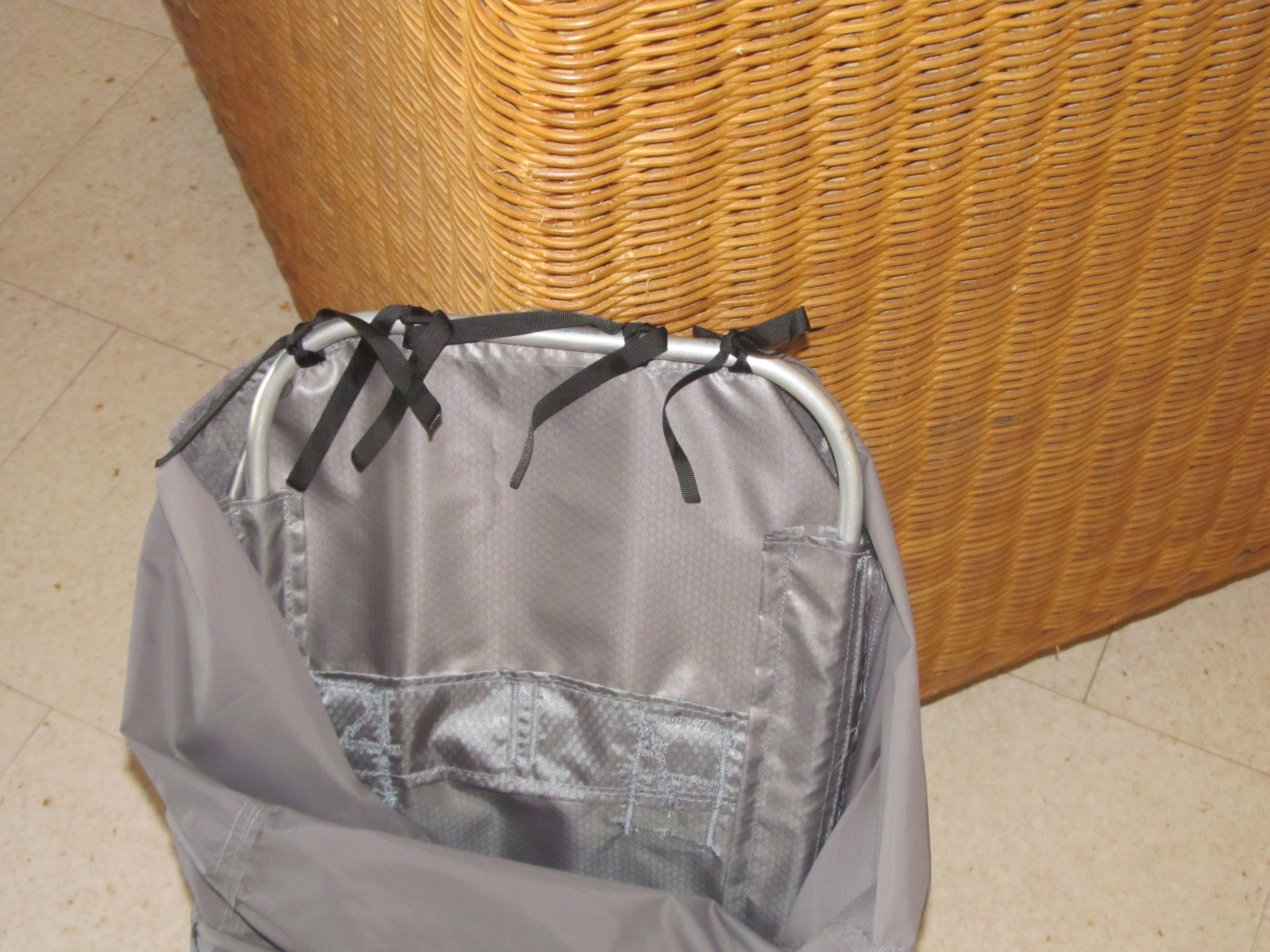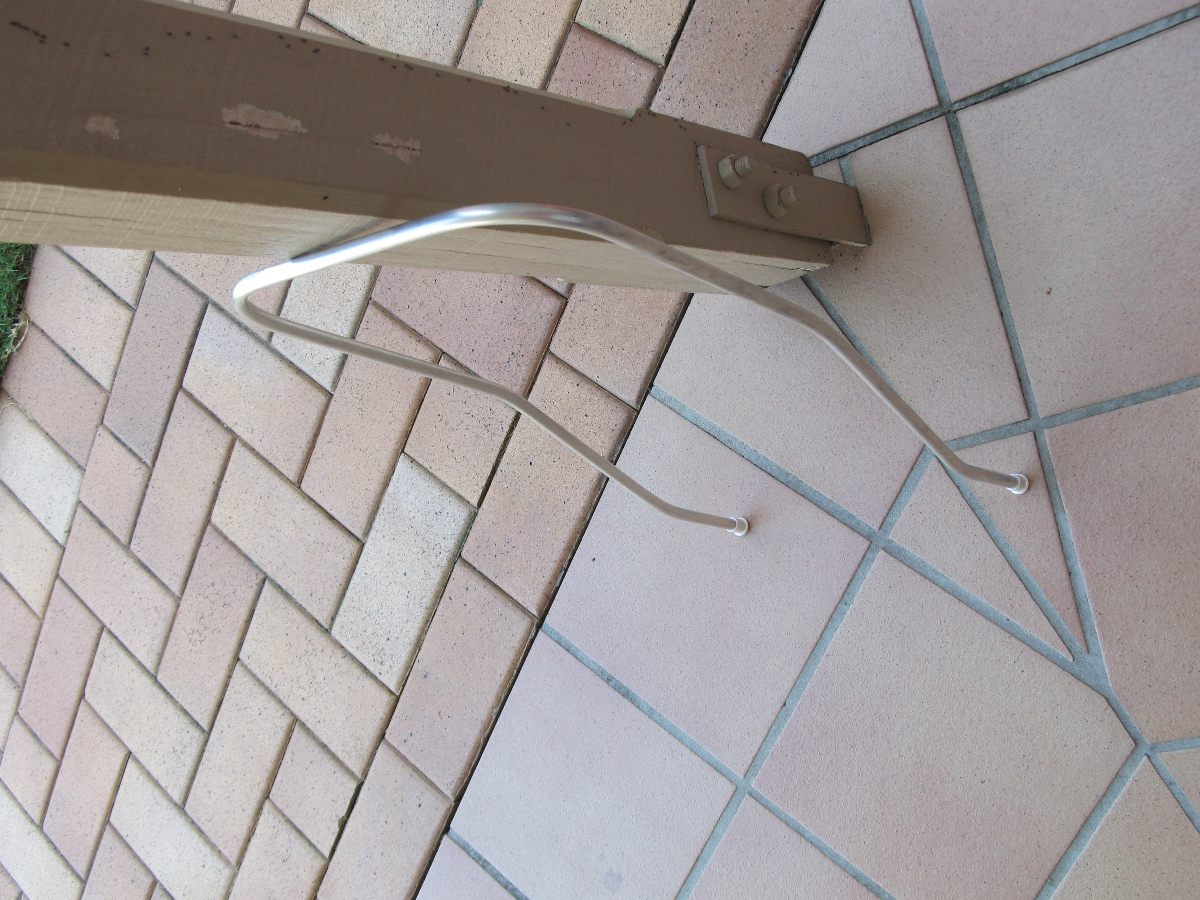 - made the frame from 10mm aluminium tube from local hardware store, $6 for 3m length. Plug one end by hammering in a piece for garden cane, fill with running table salt, tap and refill. Hammer in another piece of cane to compress the salt (this inhibits the tube from kinking). Hand bend over a childs rubber rimmed wheel in a vice, cut over length, try and cut to the correct size. Hammer in two plastic furniture stoppers inot the frame feet to stop the frame ends cutting into the fabric.