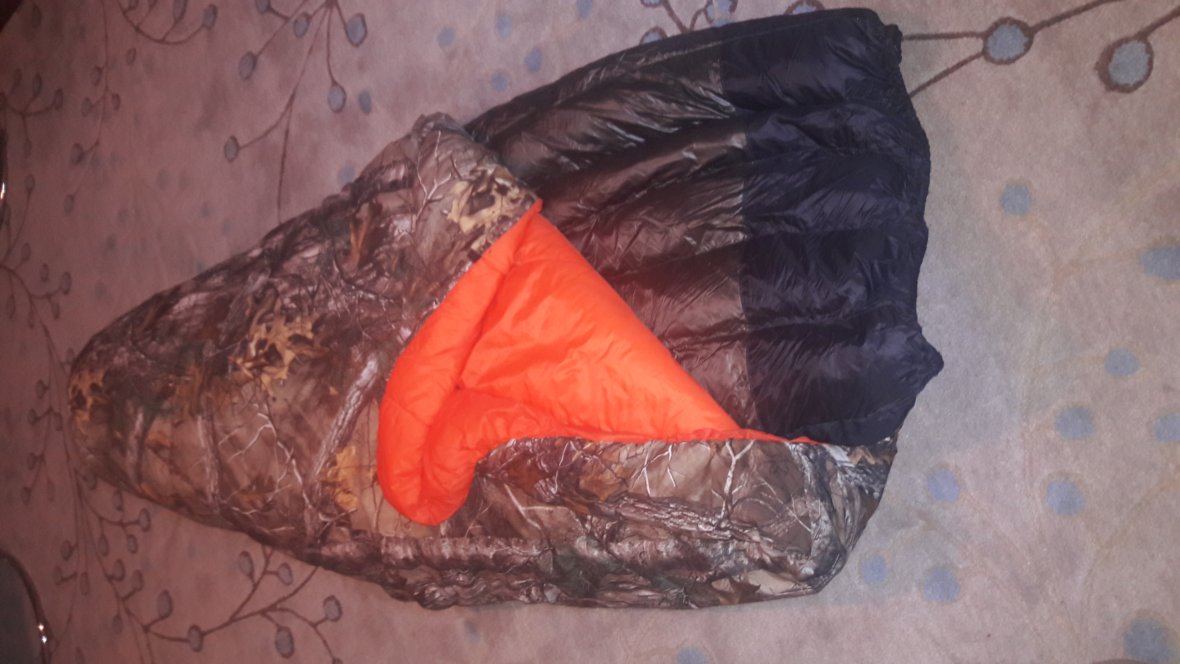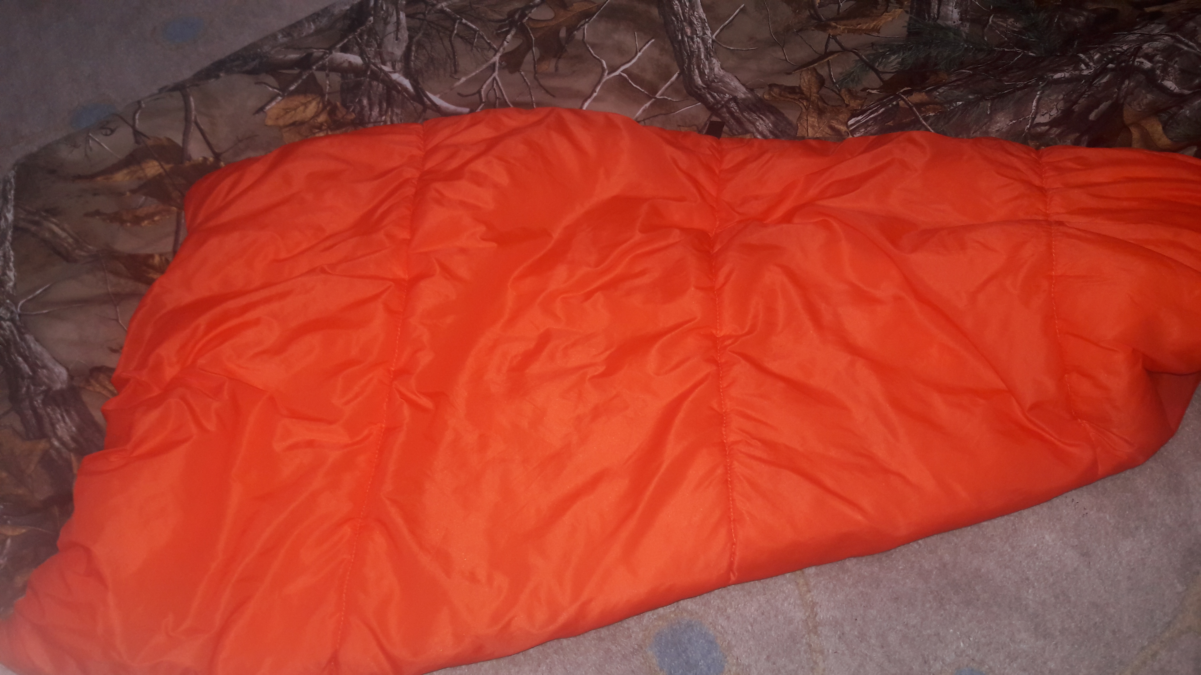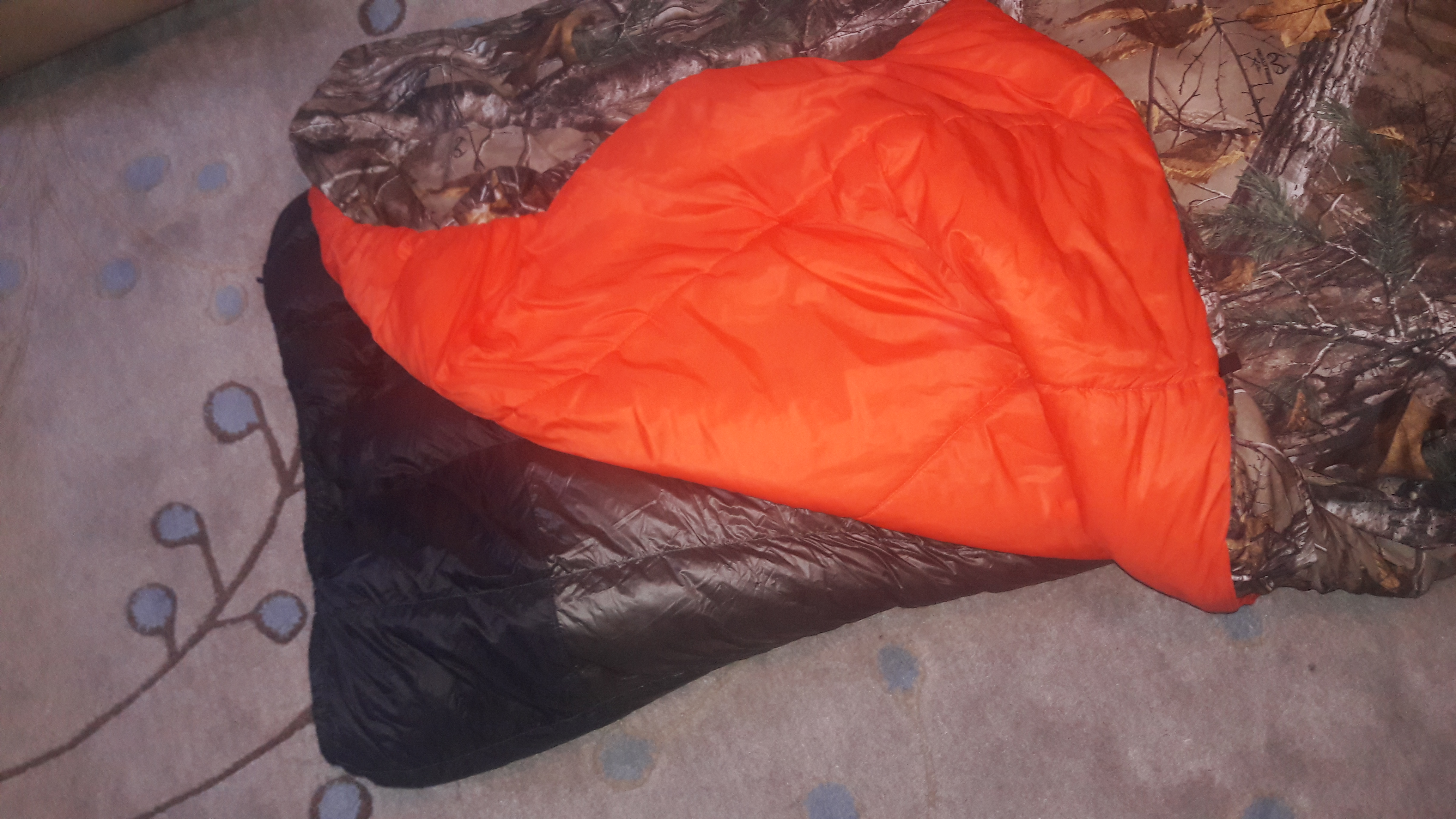 I took a somewhat unorthodox approach to making this quilt. Having grown up in a drapery and upholstery shop I have maintained good sewing skills and did not mind making a more complex quilt than I might otherwise have. I cannot stand drawstrings bottoms on quilts, so I chose to put a zipper in the foot of this quilt to allow ventilation and this has proven to be a superb idea. It extends the quilts upper comfort range from about 70f up to 73f and that is really  a key range of temps. I sleep under this quilt 365 days a year, indoors and out, so comfort and flexibility is paramount.  I also chose to quilt the APEX to the inner layer of the quilt. This was done to keep the Blaze orange inner layer from tangling in my twitchy feet and gangling legs at night. I left the outer layer of fabric unquilted to avoid mist or dew seeping through and to further avoid cold spots, I used two layers of APEX in the quilt. The inner most layer is quilted as noted above and the outer layer above it is not quilted but is only sewn around the edges. This arrangement has also proven to be an excellent design. I made the APEX quilt just lightly larger than the Enigma so that it would both wrap around the side of the Enigma and fasten to it via the Grosgrain tabs that I sewed into the quilt. Additionally, I made the APEX quilt just slightly longer than the Enigma so that it would provide adequate coverage for my shoulders and would cover my neck just the same as the Enigma. I used the waistband elastic to create a mildly gathered neck on both quilts. (I just took the top seam out of the enigma and sewed a gathering stitch with the elastic exactly as I did with the APEX quilt.) One other thing to note that I believe is important. In order to avoid a lump under my knees I made sure that the expansion/reinforcing joint at the footbox of the APEX was about 2 inches further down my legs than the Enigma. My wife insists that the fable of the 'Princess and the Pea' was written about me. Ha. What does she know, I've seen her sleep on the deck of a rolling sailboat in the middle of a storm on the ocean...seriously, some thing is wrong with her. :) Which brings me to my final point. The combination of these materials is SUPERBLY comfortable. The 1.1 ripstop un-calendered nylon inner liner is like a wonderful satin sheet, very snugly and not too slick. Perfect for this application. I sure hope the Realtree Xtra is available for some time as it is the cat's meow for an outer fabric. Soft as heck, sturdy and water repellent enough to fend off heavy dew and mist while not being crackley like many DWR fabrics. It is perfect for an outer quilt. This quilt packs down into my pack extremely well. At 27 oz it is the perfect companion for the oversize, wide/long Enigma 20 quilt which weighs in at 25.5 oz. For a combined weight of 52.5 oz or 3.28lbs I have a sleep system that is very comfortable from 73f down to 10f. I've tested it and it is fantastic. On cold nights, I sleep in only a light or mid weight long underwear and a long sleeve capilene top. If you have not yet ventured into the world of layering your quilts, I say try it, you just might like it! Ohh yeah, please don't tell my wife I said something is wrong with her. I'll end up walking with a limp for months.