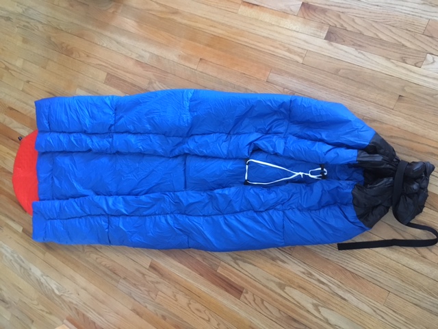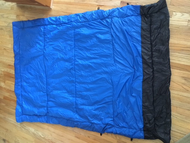 I wanted a summer/early fall light weight quilt for use on the trail or for use in camping out on floors while traveling. I also wanted it to lay flat so it can be a wrap-around-blanket, not have any zippers or velcro for weight or scratchiness, but still be able to have a foot well for use with a sleeping pad when desired. The foot well is achieved by putting webbing 'belt loops' along the bottom at 8 in. internals and using a webbing belt to cinch it into a foot box. There are also 4 loops on both sides to tie together to have the bottom 1/3 conform to the shape of a sleeping pad.