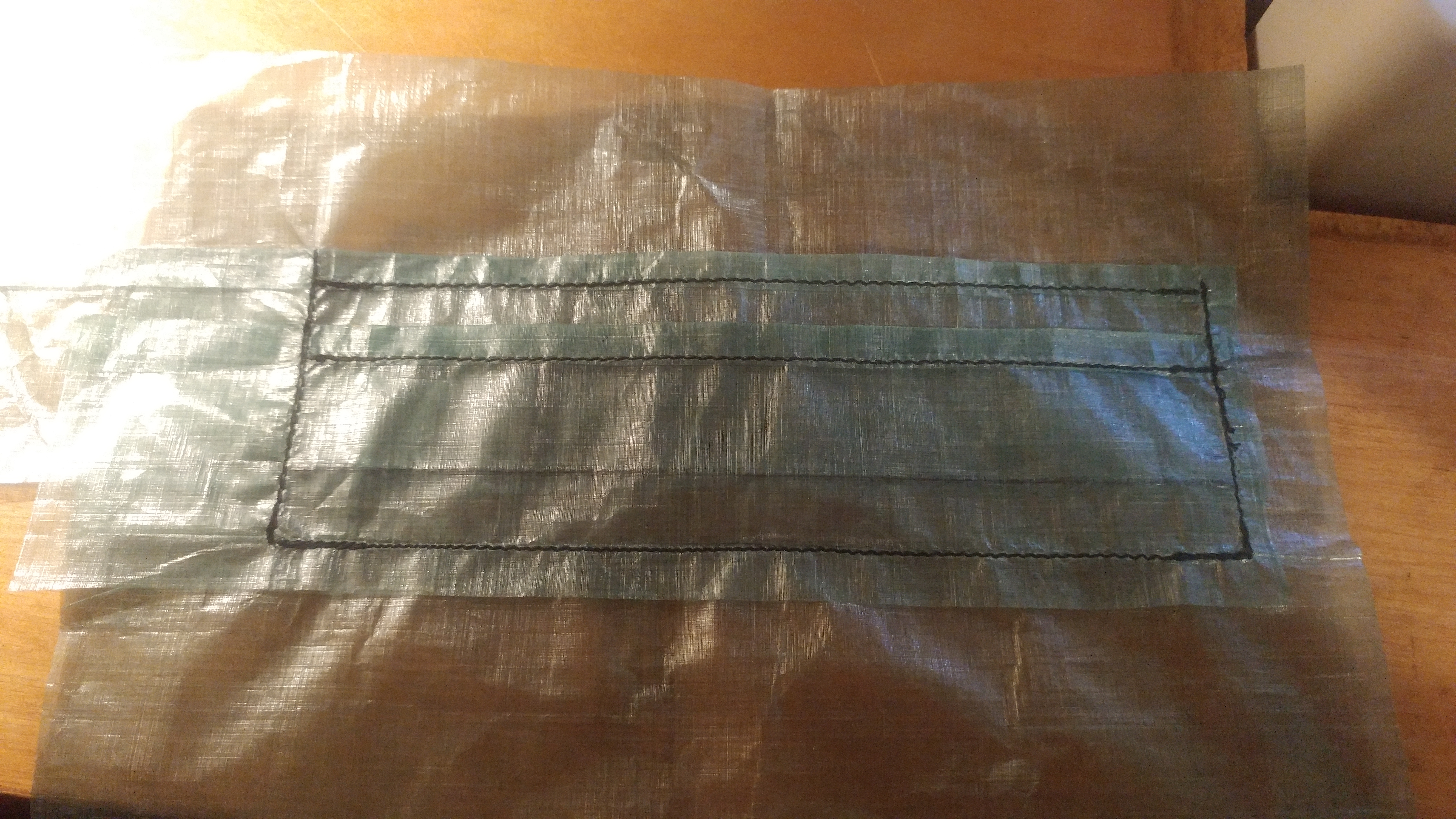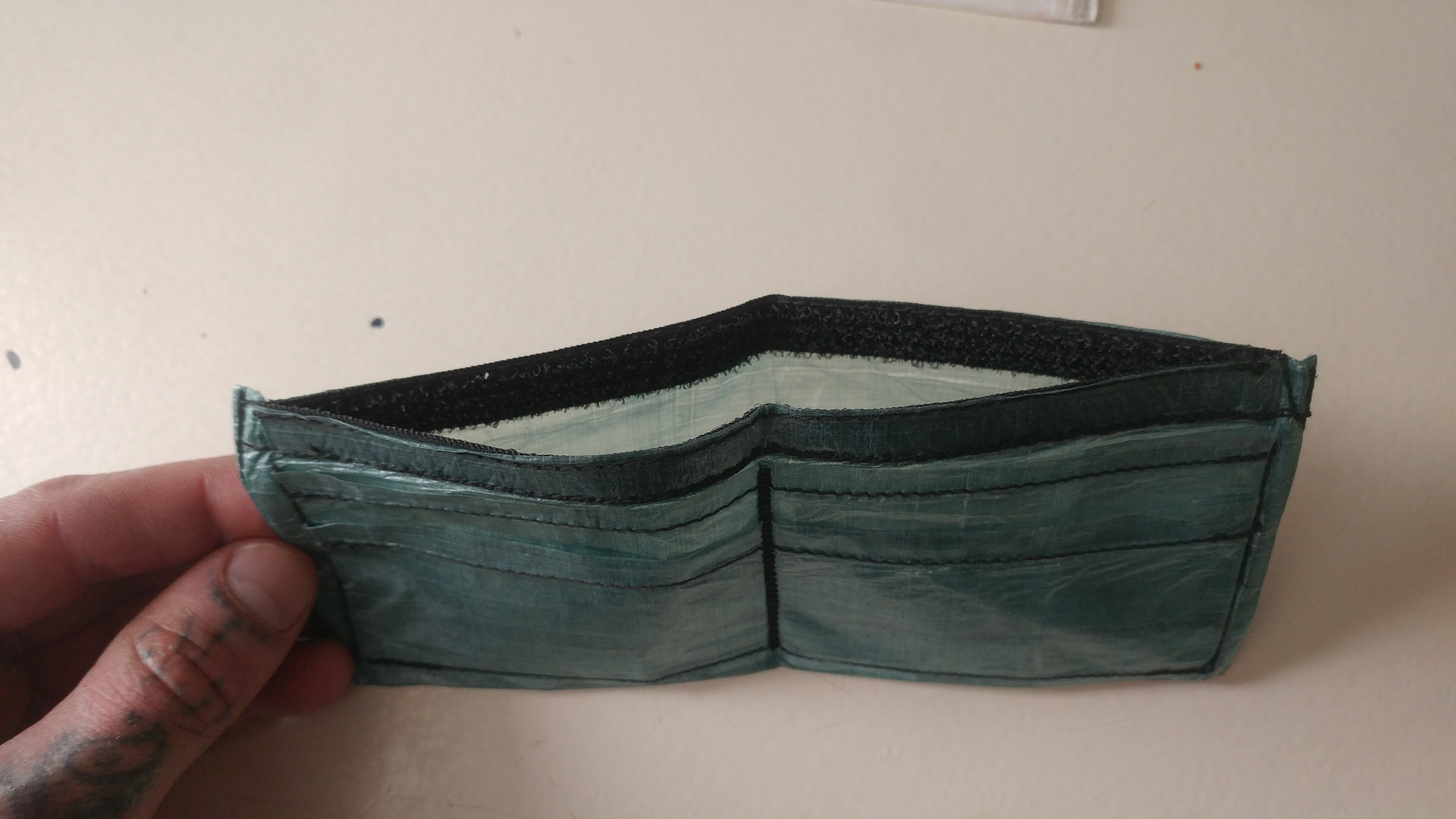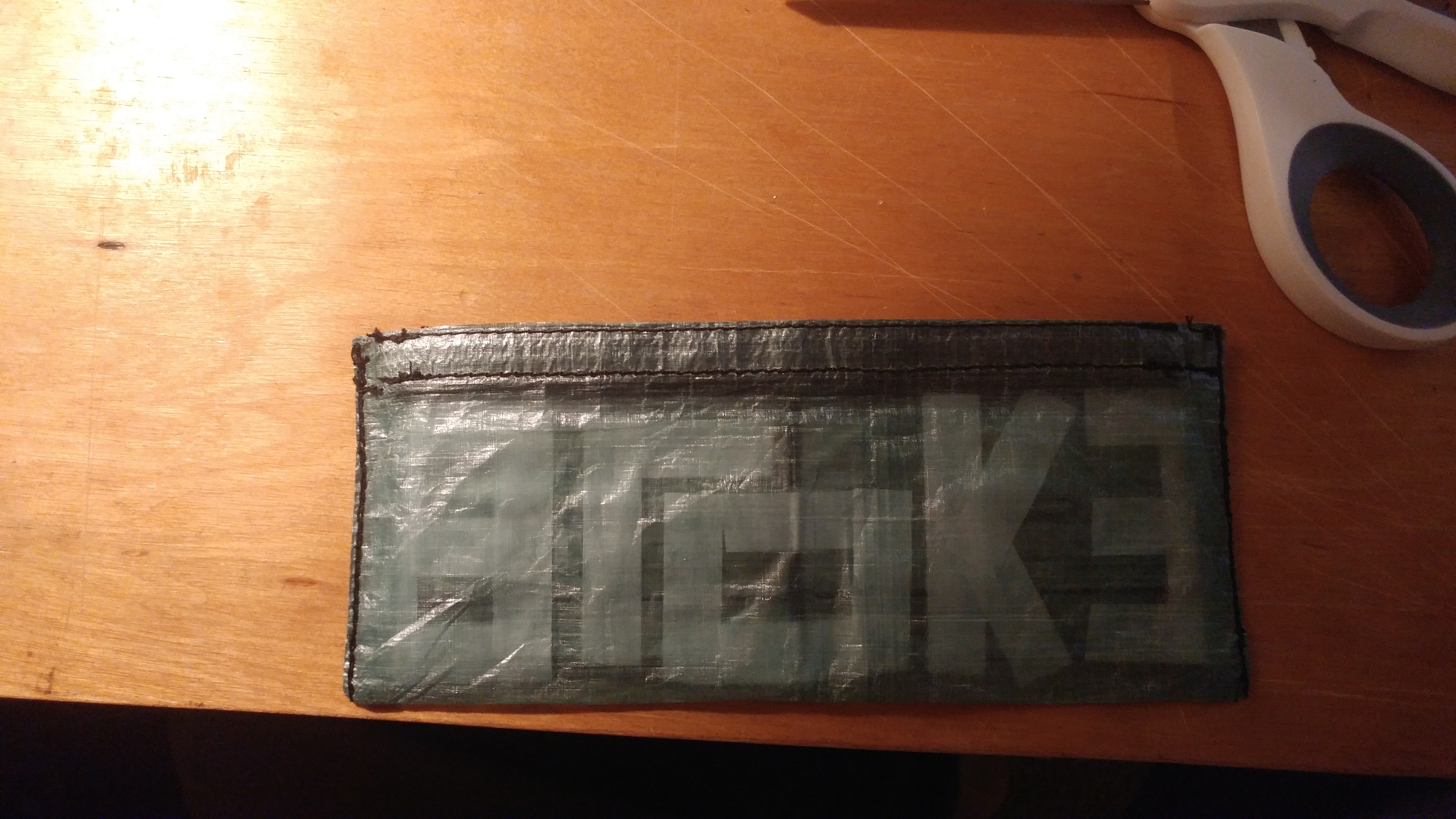 I started by outlining my license and credit cards to give me an idea on how big the pockets needed to be (I made sure I went a little bit outside the marked line giving enough slide space for the cards). I then started to fold all my edges, creating the outer dimensions of my wallet. Since the dyneema material is somewhat slick, and knowing my wallet was going to weight practically nothing, I wanted to make sure my money stayed nice and secure. So I added a small piece of omni Velcro tape to the inside money pocket. After laying down my last stitch I noticed that I could see through the back of my wallet, revealing all my rough stitch lines from the front. I wasent happy with the way that looked so I decided to give my wallet a little more character. I took some dyneema tape and spelt out BROKE on the inside money pocket. It hides the stitches very well and also acts as a personal bank teller, making sure I know how broke I am constantly...