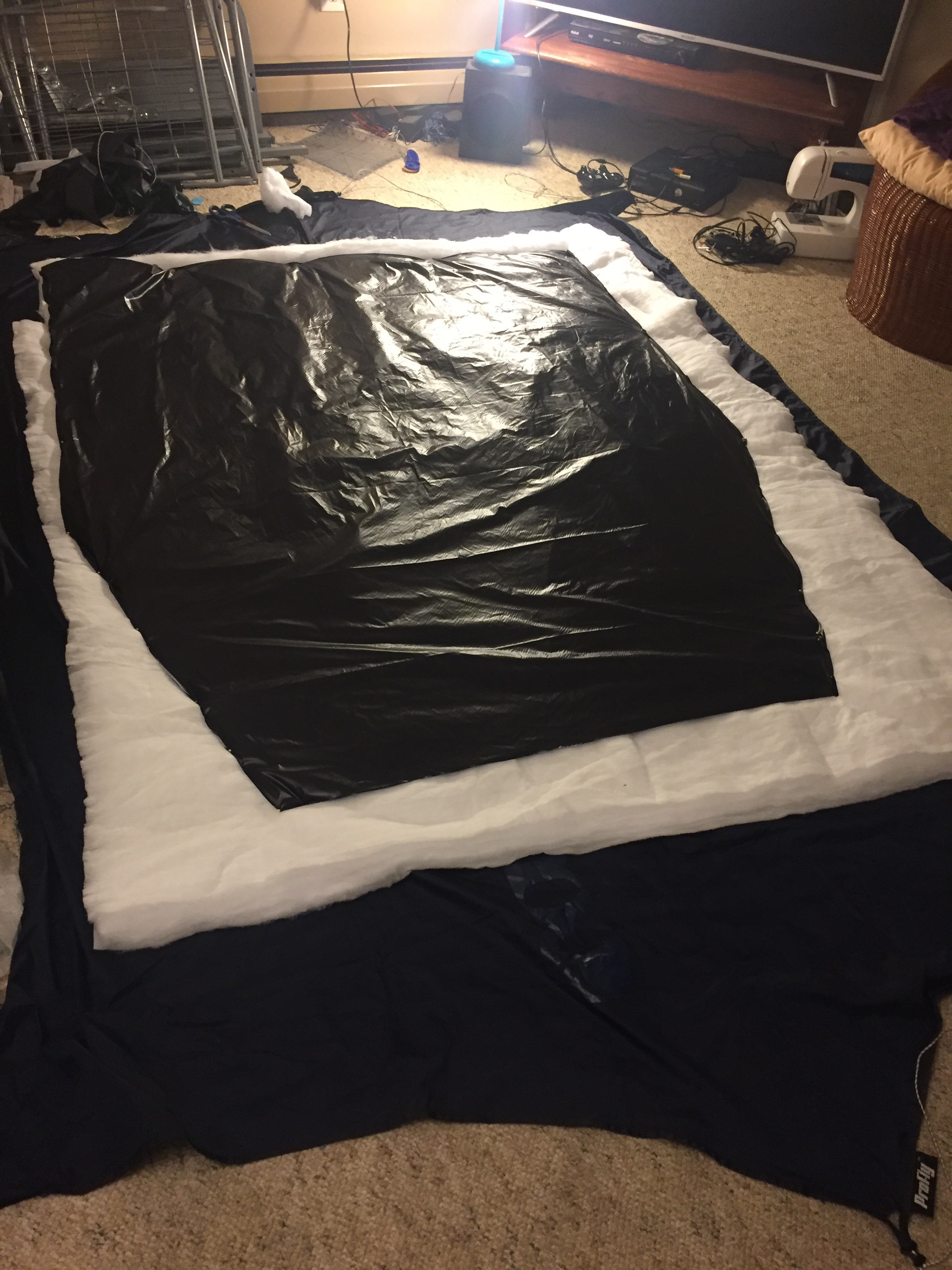 1. Lay insulation out flat on a clean surface. Lay the 0.66oz membrane 10 taffeta nylon on top and the hyperD nylon on top of that.