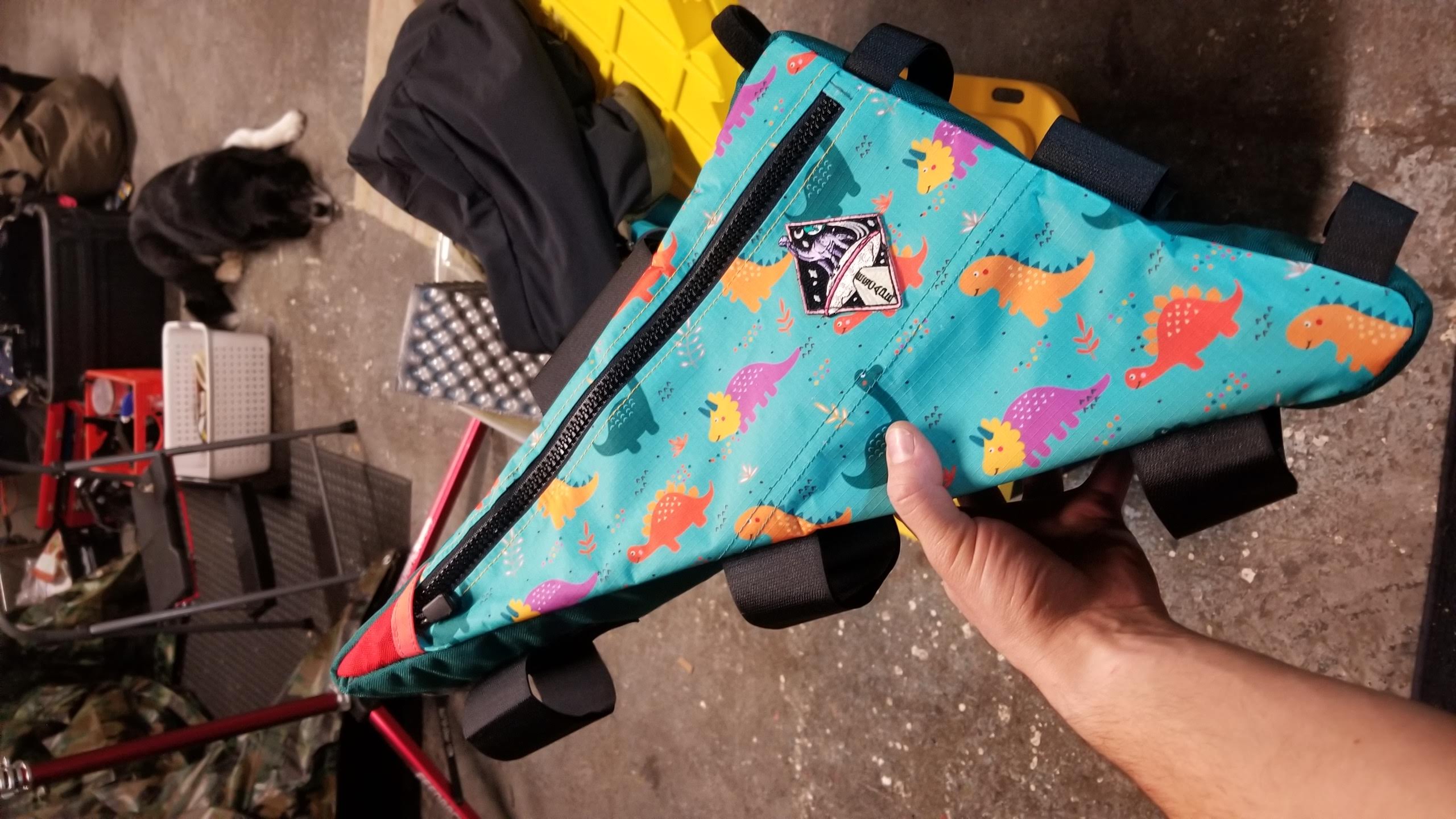 This is a tapered framebag that I made for my partner's Salsa Mukluk fatbike. It has all the space for layers, water, and snacks on snacks. Both sides use a YKK #10 molded tooth zip for durability when over-stuffed. Drive-side is one full sized pocket, and non-drive has a 6" tall sleeve for phone, tools, etc.