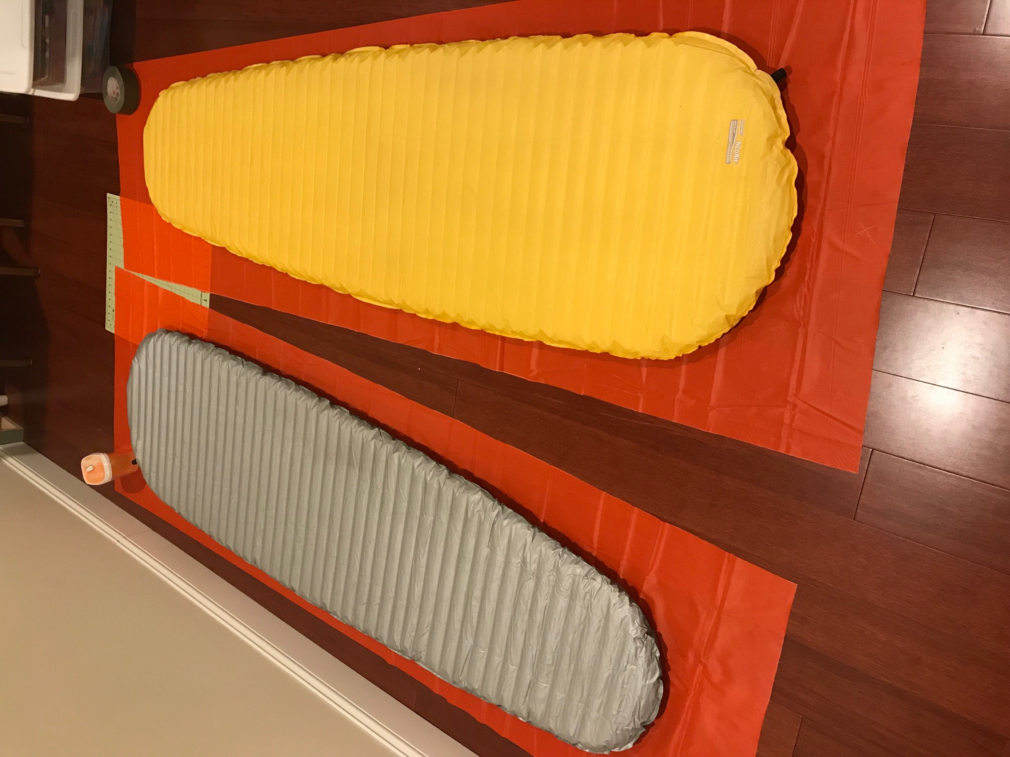 I cut my fabric to 8' length, then cut a diagonal to make two mattress footprints. Sewed a rolled hem along the edges, then tacked a 5" loop of grosgrain at each corner for a tie down. I added two additional tie downs 10" from the bottom, so I can roll up the footprint to prevent the mattress from sliding on a gentle slope.