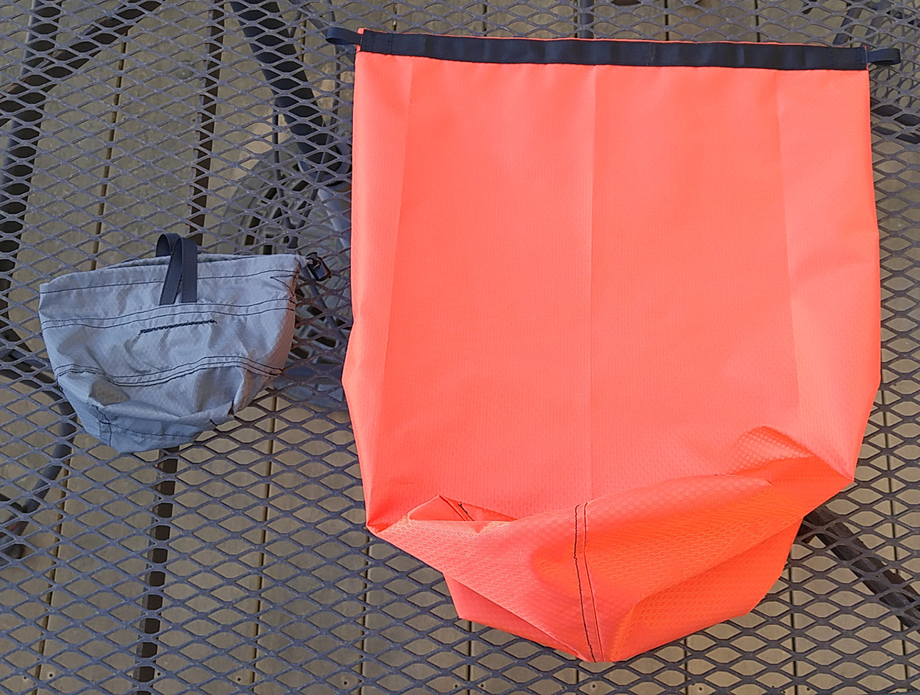Food bag - I sewed a 3/4" hem along the top edge of the HyperD300. Then sewed the bag inside out, followed by sewing and cutting corners on the bottom of the bag to create a square bottom. After the square bottom was finished, I added a top stitch to each seam for reinforcing. Lastly, I sewed 3/4" grosgrain along the top hem on half of the bag (to give stiffness for rolling the bag shut) with the 3/8" clip tags sandwiched between the grosgrain and HyperD. I finished it off by adding reinforcing stitches to each of the 3/8" tabs.