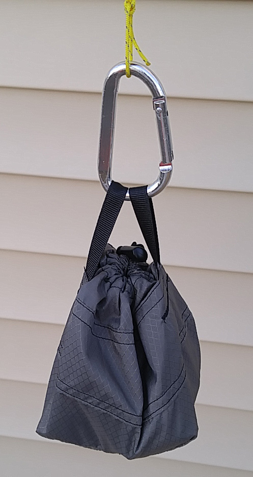 Throw bag - I sewed a hem along the top edge of the fabric large enough to allow the drawcord to slide through. Then sewed the bag inside out, added stitches and cuts to make a square bottom, then reinforced each seam with an additional top stitch seam. I then sewed in a triangular piece of MTN XL right under the drawcord openings to reinforce the seam. Then I tack stitched the two pieces of 3/8" grosgrain to each side of the bag to hold them in place. I then sewed a second piece of MTN XL around the outside of the bag, sandwiching the grosgrain, to add strength. I finished the throw bag by adding reinforcing stitches through the grosgrain and both layers of MTN XL, then added the toggle lock to the drawcord.