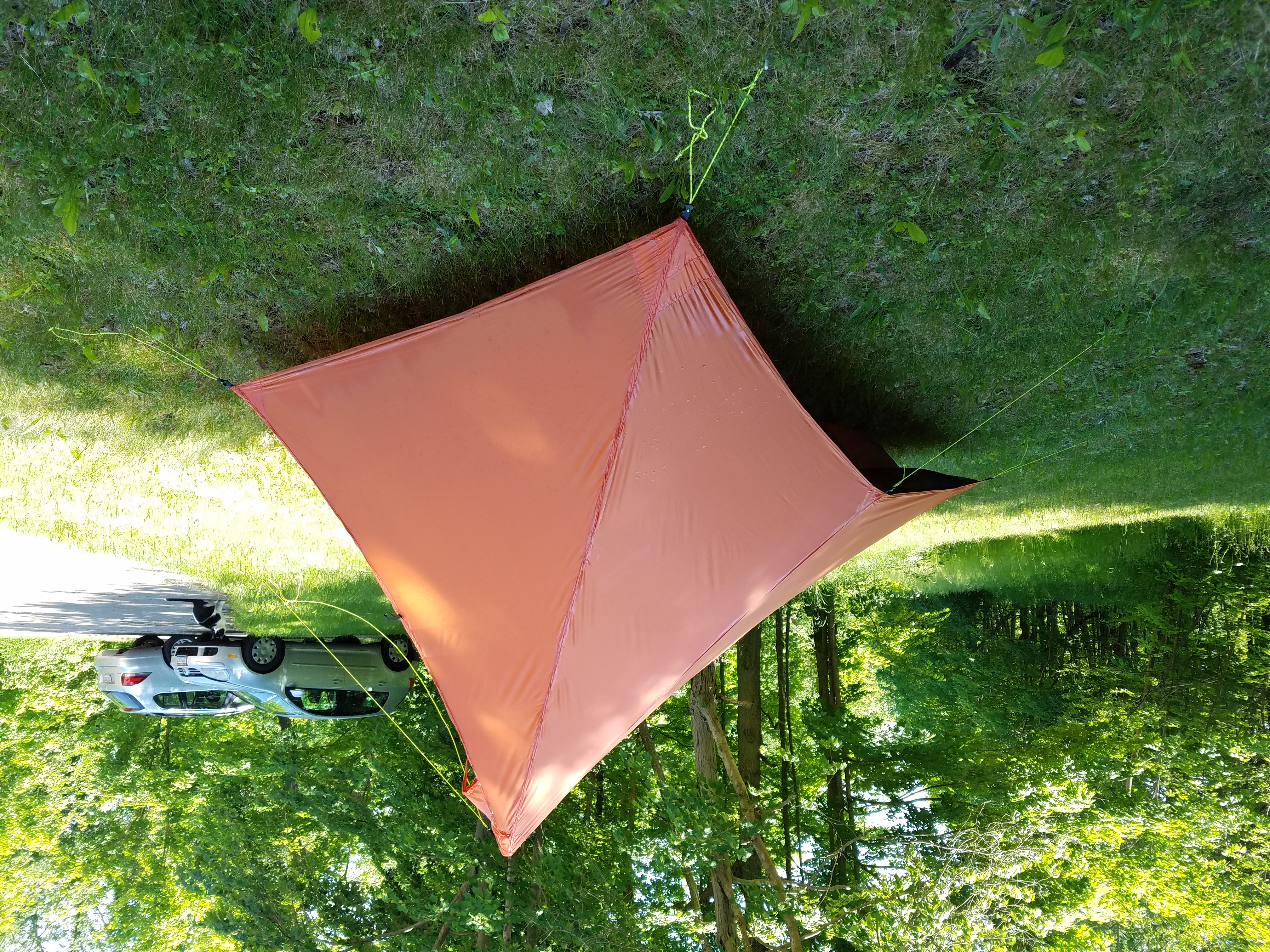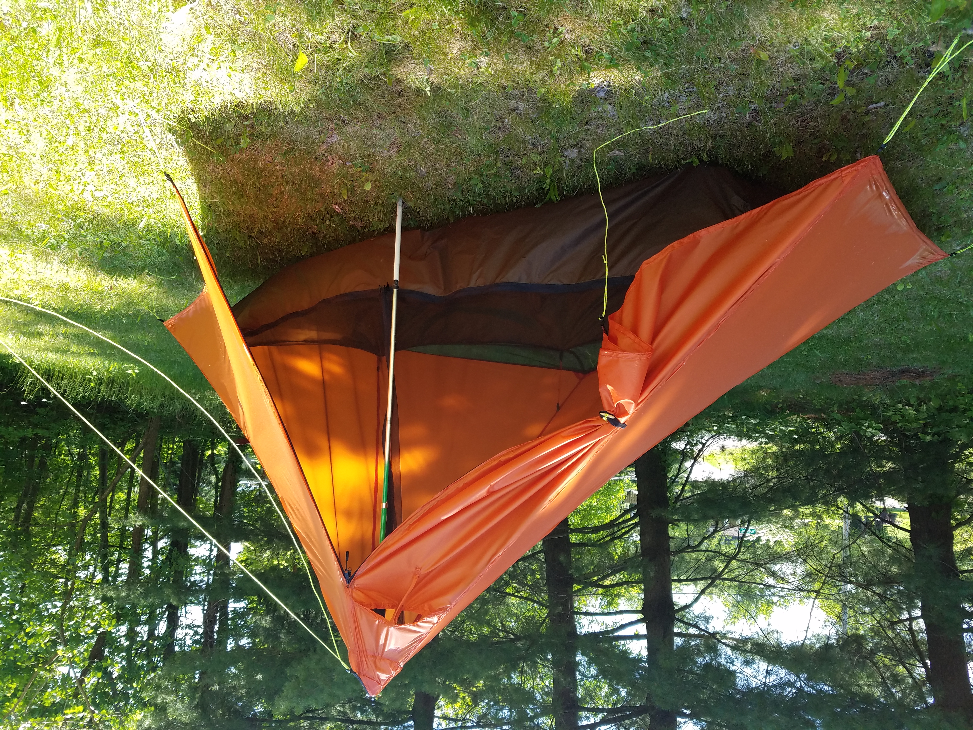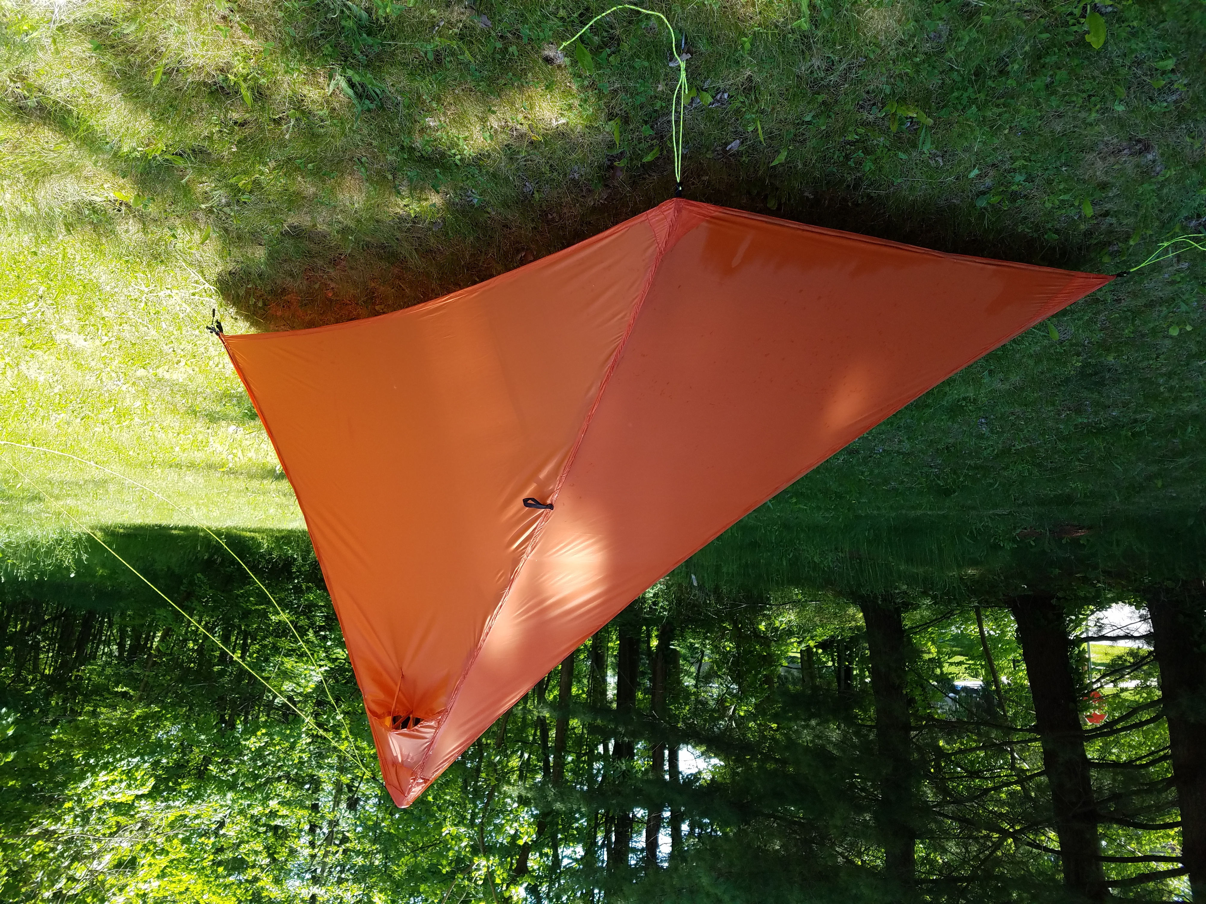 This is a single wall, half pyramid tent with an attached tub and bug mesh. The weight is 25 oz with lines and seam seal. Lineloc 3s are used for staking the structure down. A minimum of 5 stakes are needed but 7 are ideal.