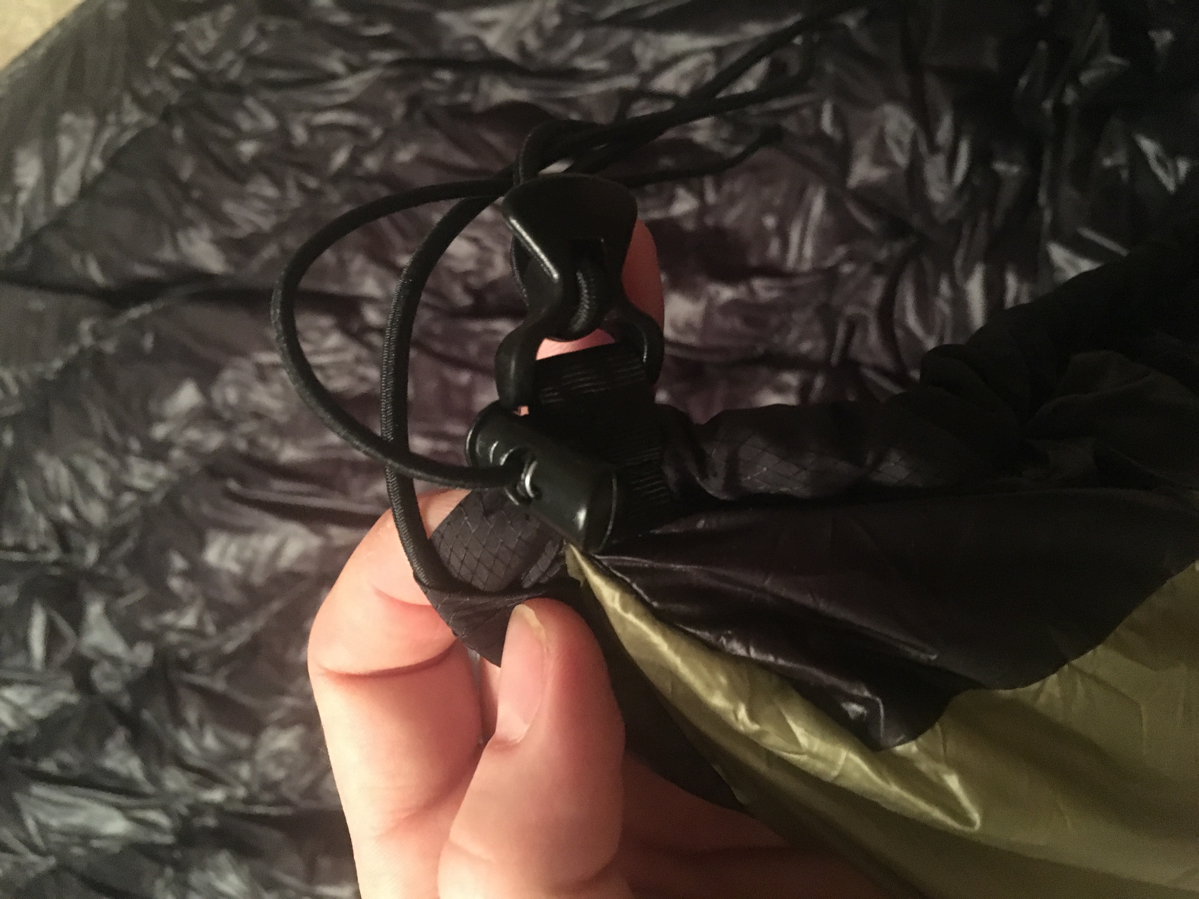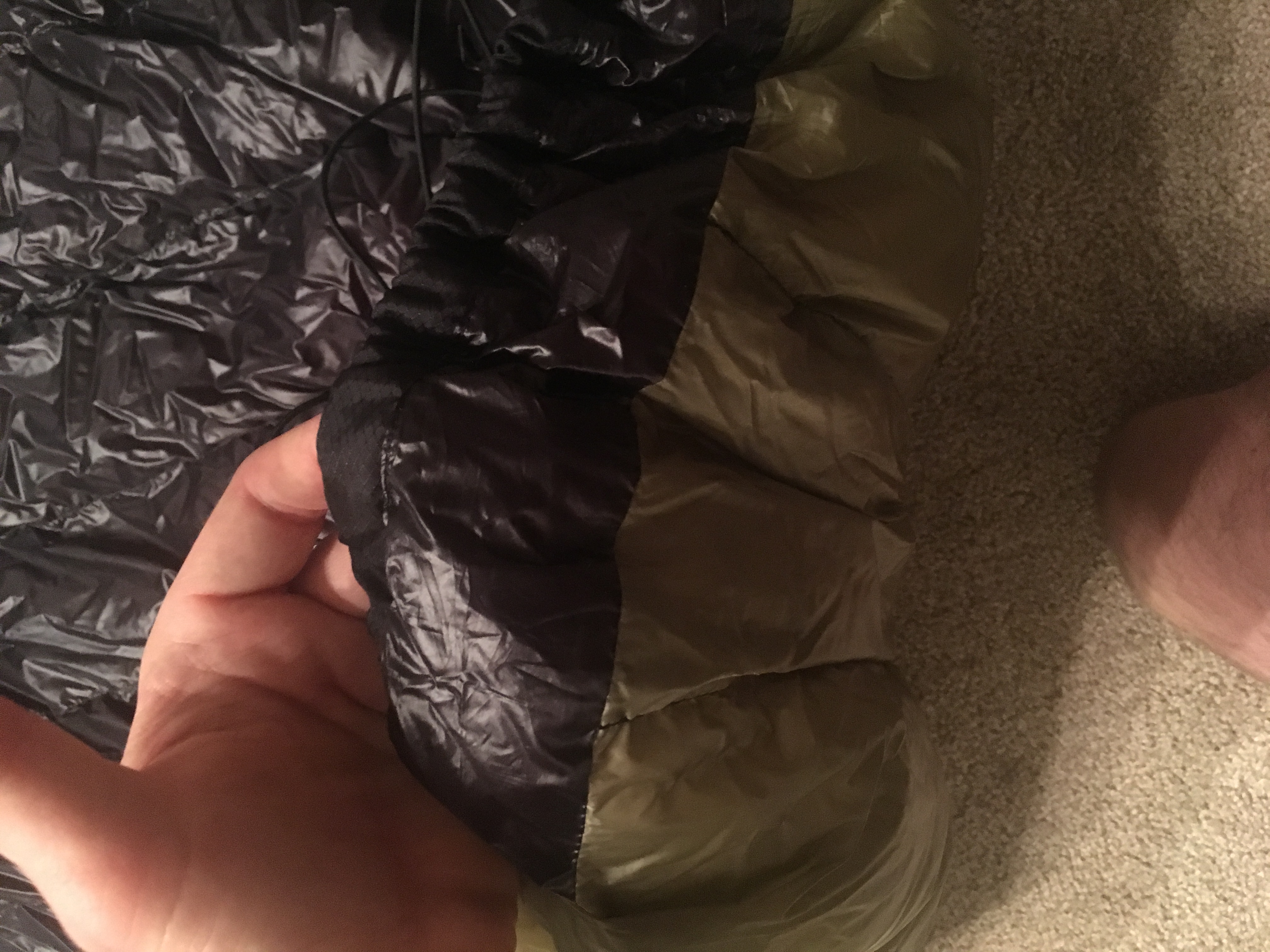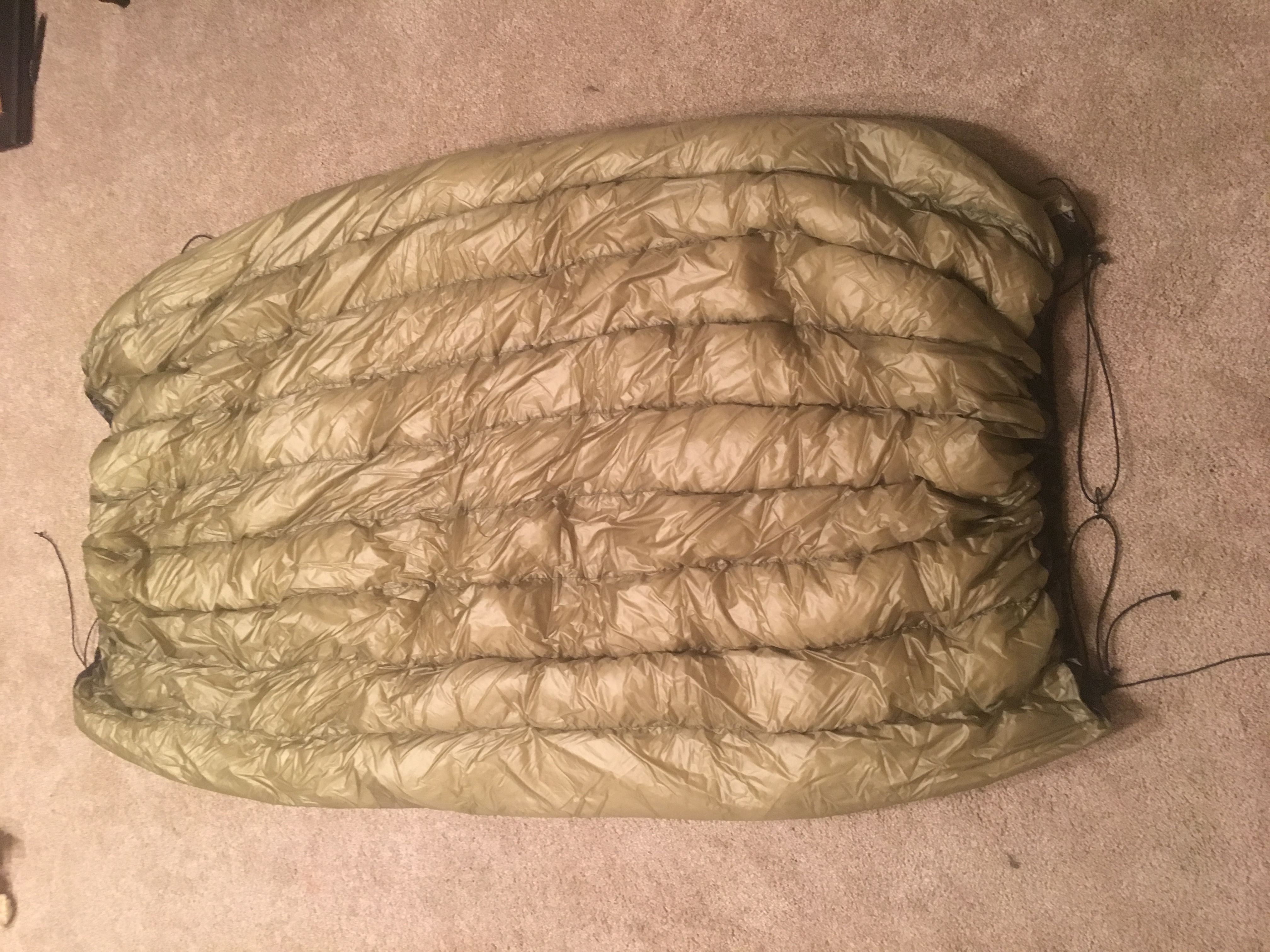 I used Membrane 10 for the inside and out. The outside is Olive Drab and the inside is black. I used the precut 2.5" baffle material (worth every penny and then some). The end cinch channels use 3/32 shock cord and mini cord locks. The main suspension uses 1/8" shock cord, lineloc 3's, and s biners for attaching to the hammock suspension. Lastly, I used about 13oz of 800fp down.