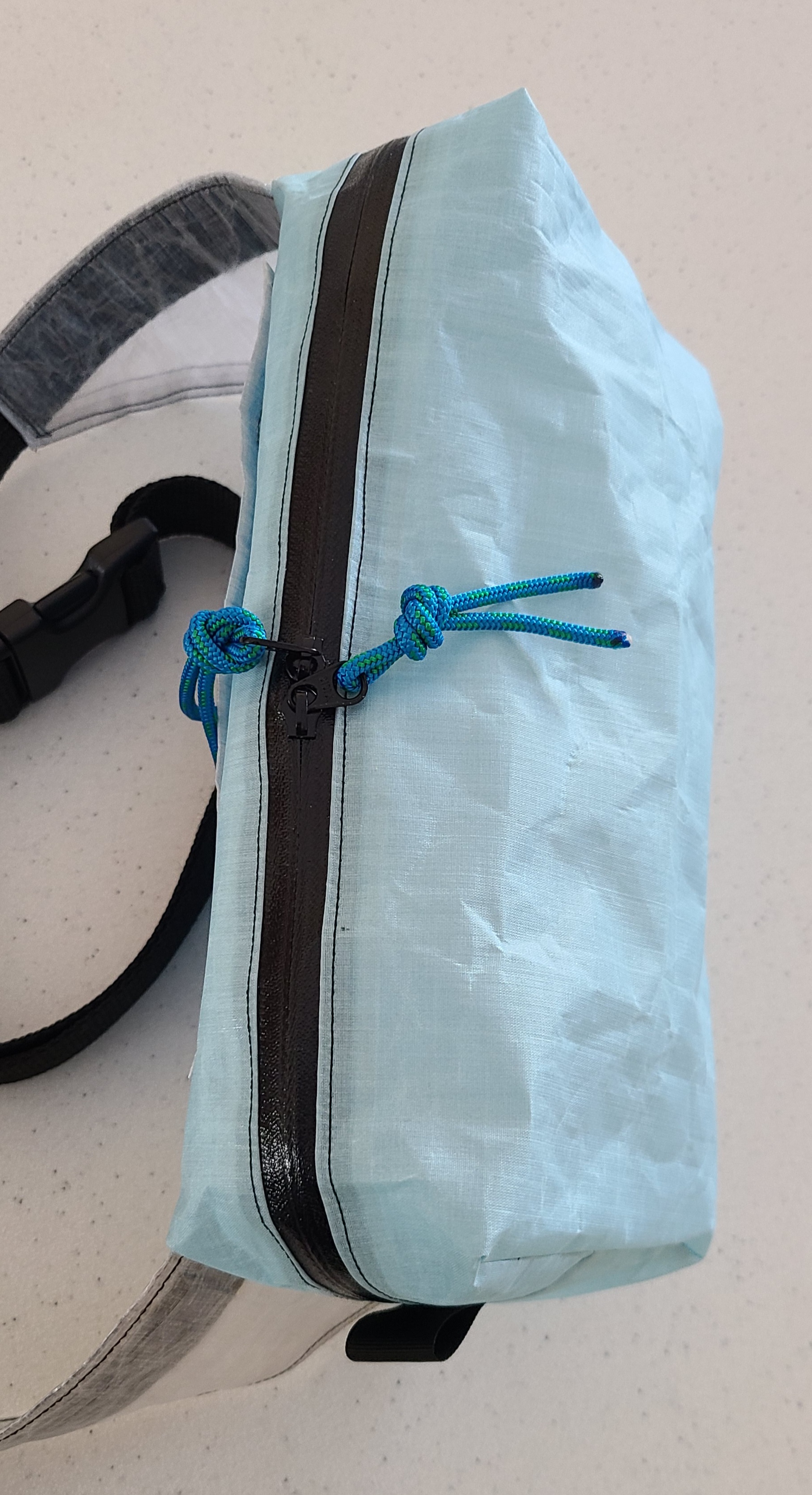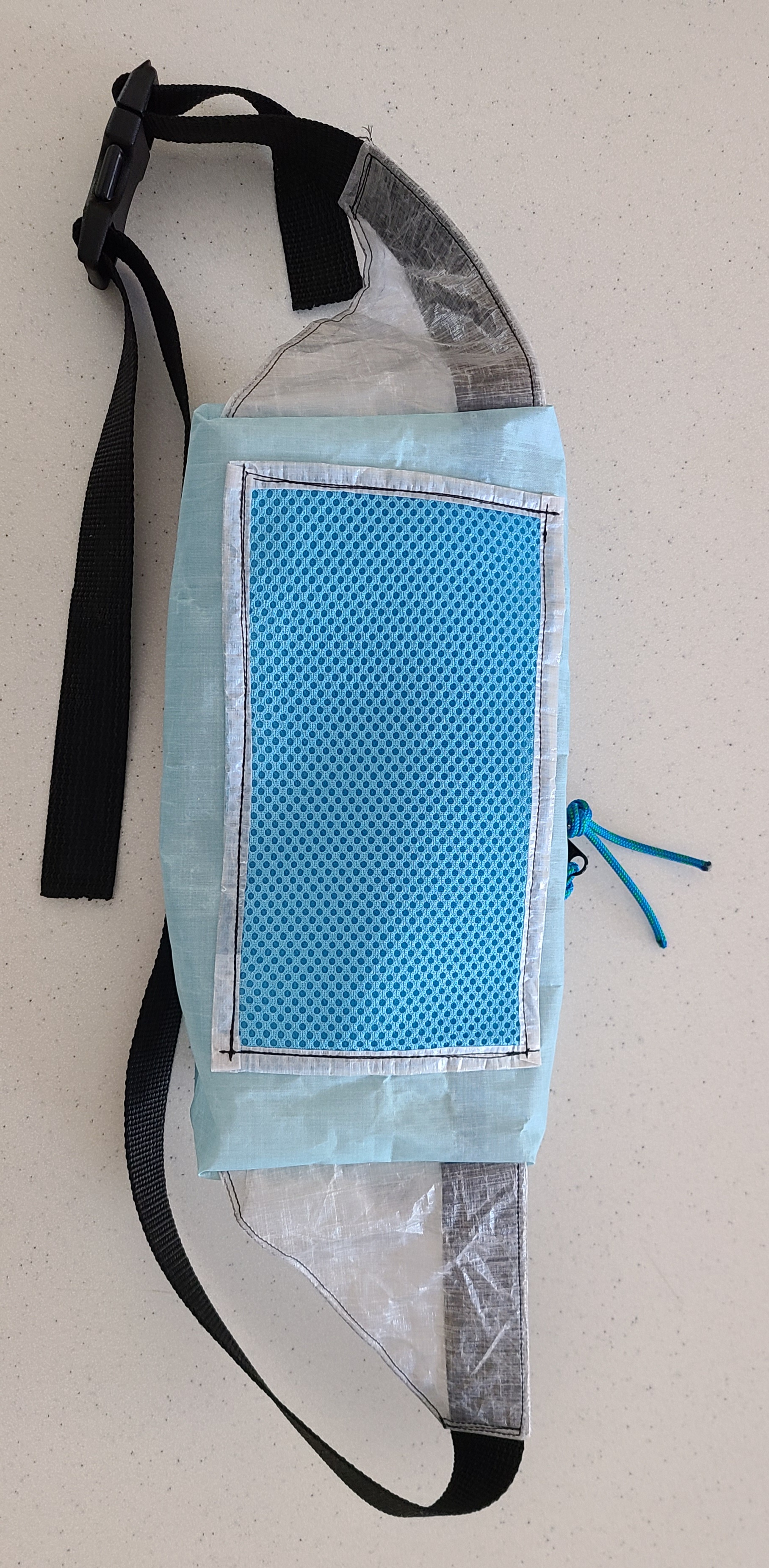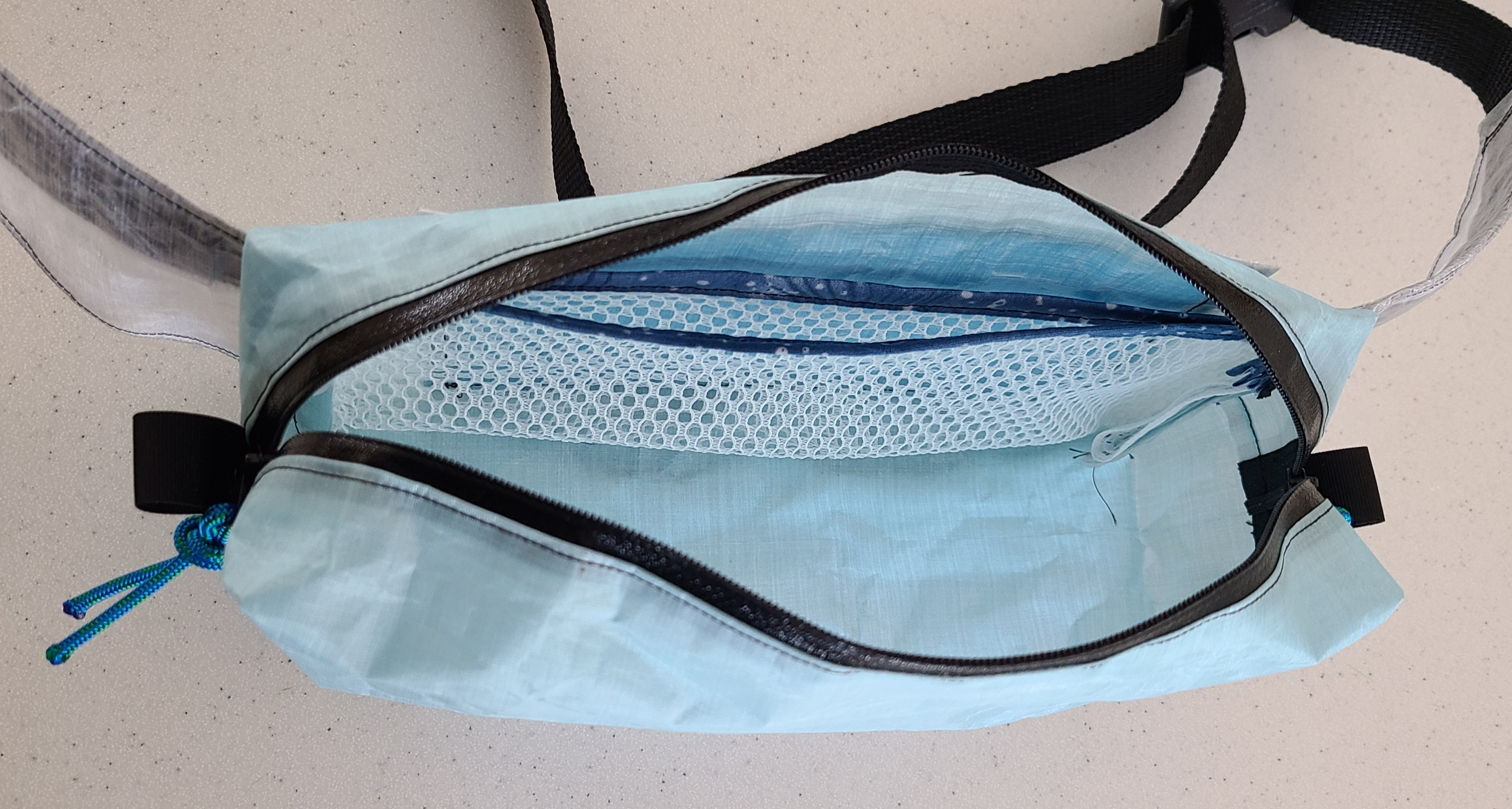 2. When sewing the box edges, sew the front two normally. For the back two, cut the dyneema before sewing and add the net pocket and side straps.