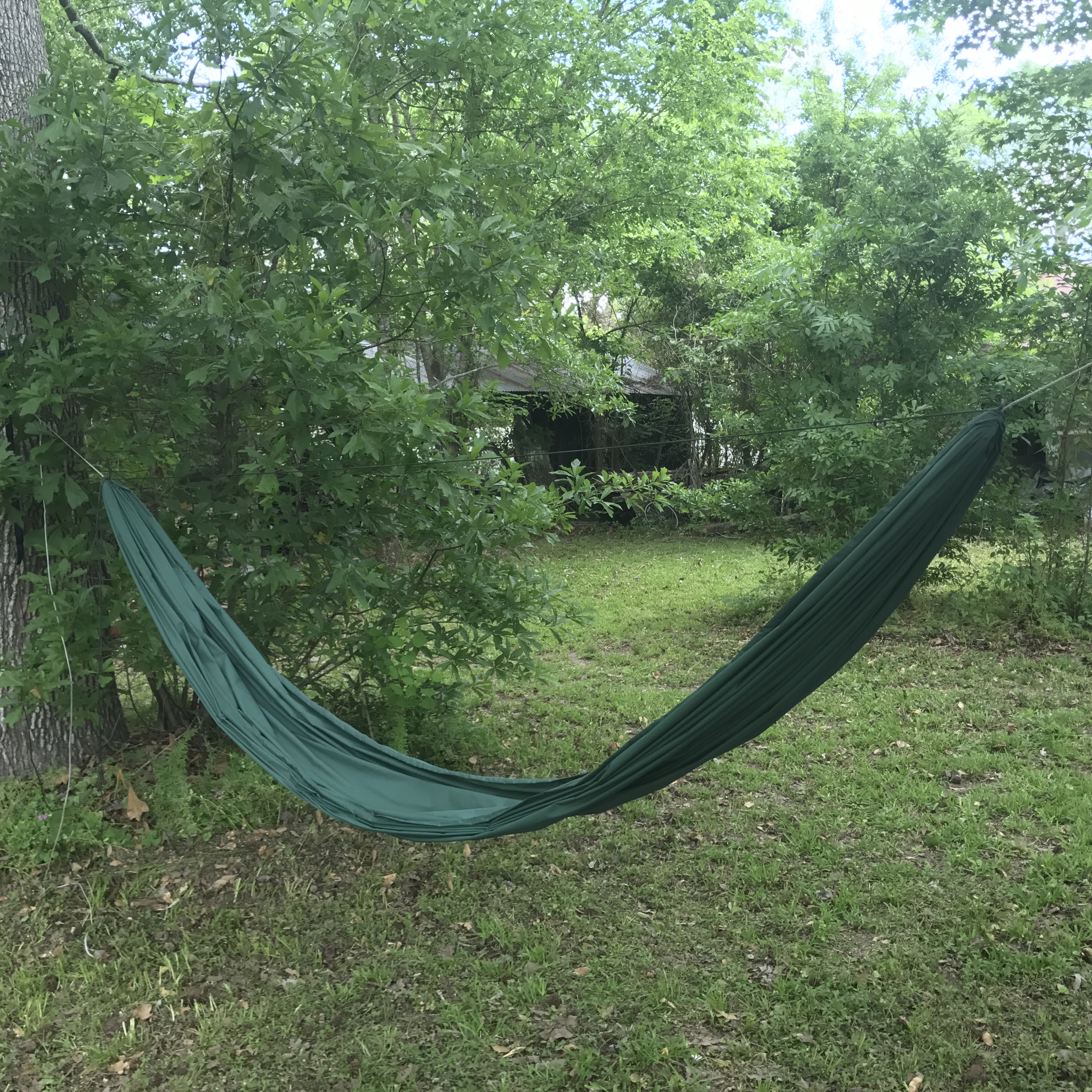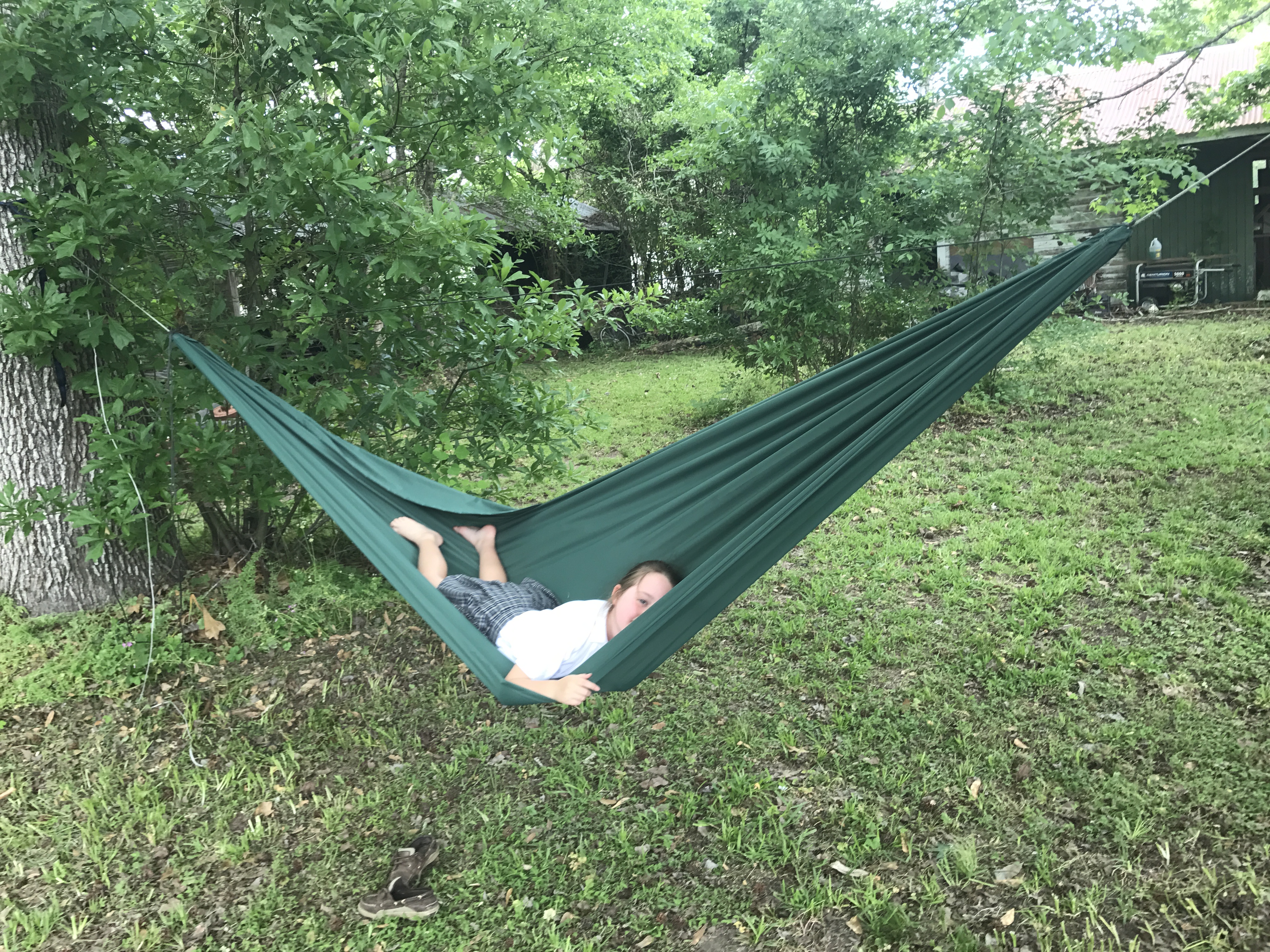 So my first try hang didn't work out. I ran the fixed loop of the Whoopie Slings through the channel of the hammock and used a Marlin Spike hitch to attach them to the tree straps. No luck. With the slings pulled all the way up, the hammock was on the ground. So I moved to another place in the yard and the trees were too big for the 6 ft tree straps. I need at least two more feet. So I took the Atlas straps from the kids hammocks and just looped the Whoopie's through one of the loops there. Whew. Finally hanging.