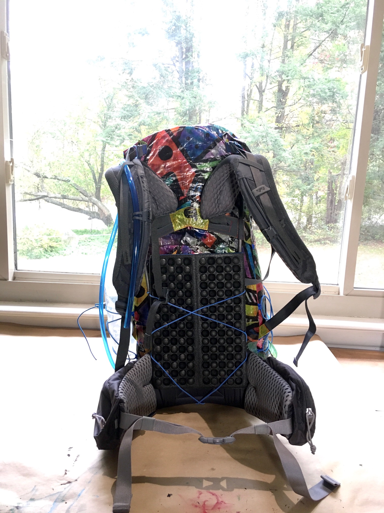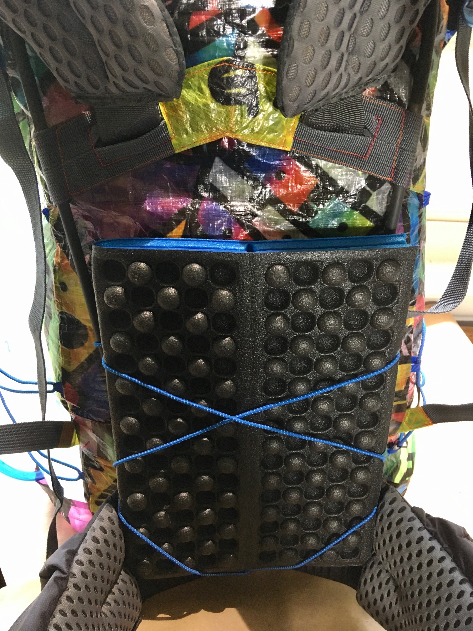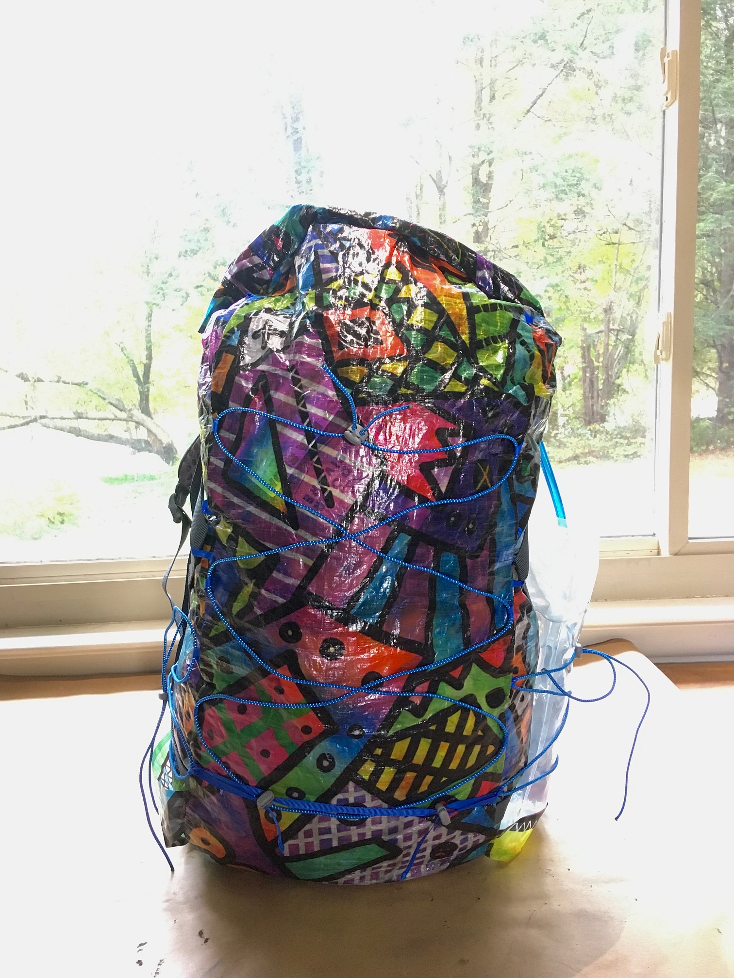 I measured other bags I've hiked with and liked in terms of comfort and enough room to fit my gear. I sketched a general design that had minimal sewing as seams add weight. The pattern is basically three pieces to make the bag. There's two side pieces and one long continuous piece that starts in the front, rounds underneath as the bottom and comes up to the top as the back. I cut and fit a practice bag out of tyvek (although tyvek is a little stretchy under tension so I wouldn't recommend this). I pinned what I could a stitched everything else to really test how the tension would work. I took this apart to use as pattern pieces and cut my final bag material, stitched all the loops and flaps on the back, sealed this from the inside with seam grip +wp. Then I laid out the loops for the shock cord on the sides and front, sewed all side seams (catching the loops in the seams). I seam taped all seams, flipped it right side out and finished the top. Some things I learned: artists tape or painters tape works much better than pins for holding things in place (also less holes). I might consider using dyneema for more of the 'hardware' like the loops for the shock cord - it seems more durable and lighter than the grosgrain ribbon I used.
