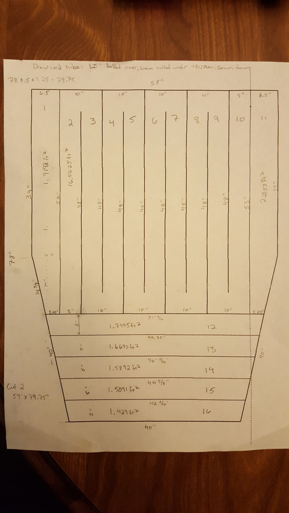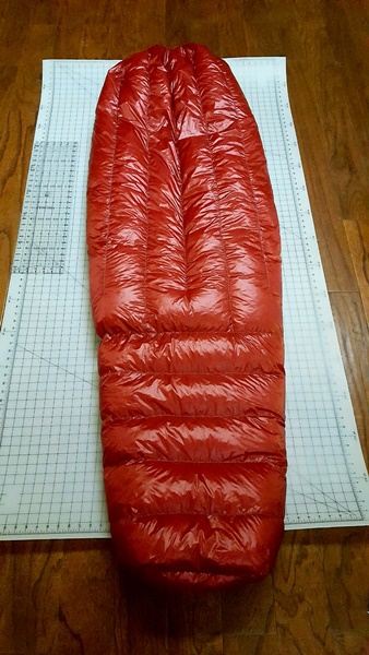 From what I've read 2.5" of loft gives approximately a 20 degree rating, which is what I wanted. I chose to cut the baffles 2.75" wide, so they would be 2.25" after sewing, and then the additional loft would come from over filling the baffles a bit. I didn't plan to use the whole pound of down, but after stuffing the upper baffles and sewing it shut, I fluffed them up, and just felt like it needed more, so I opened it up and added the rest of the down.
