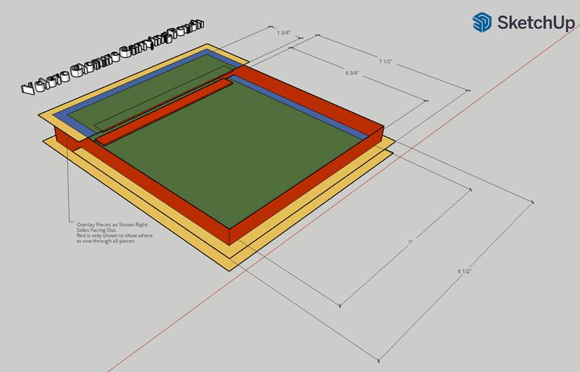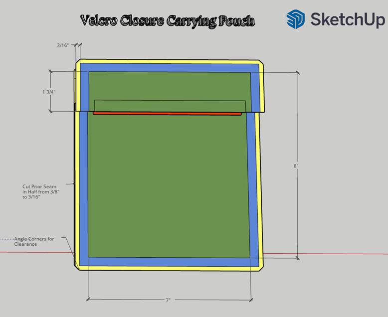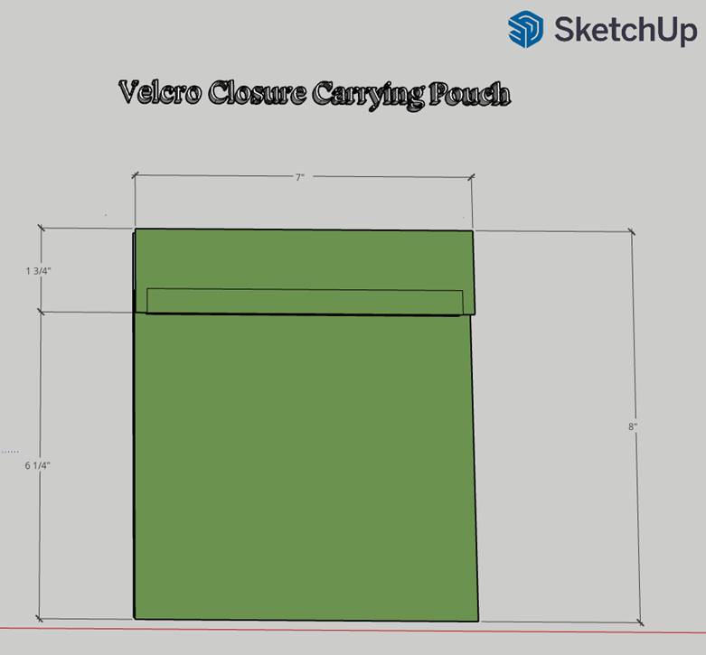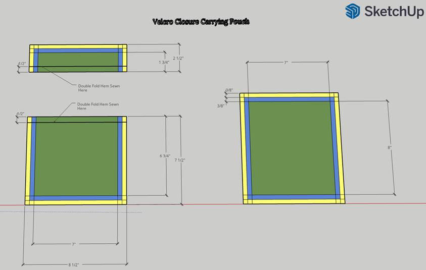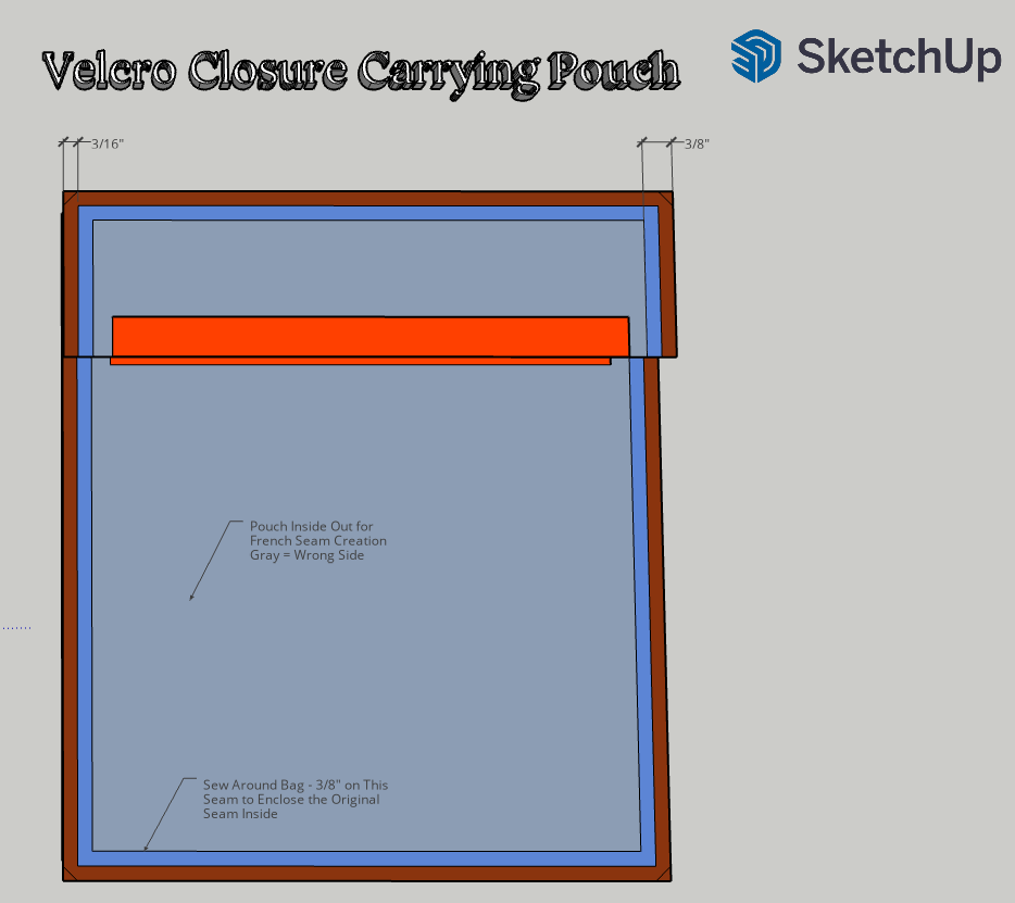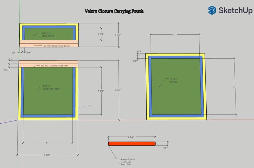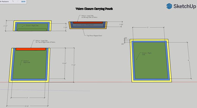 I created the fabric sizes and showed the general steps for creating the pouch in Sketchup. French seams is the key for the sides to make clean, finished edges. If a slightly different size is needed, use the dimensions shown and adjust the "green" sections to fit your particular needs. I had done an earlier version that was a little too small and just added 1/2" to the width as shown here and worked well for an iPhone XR.
