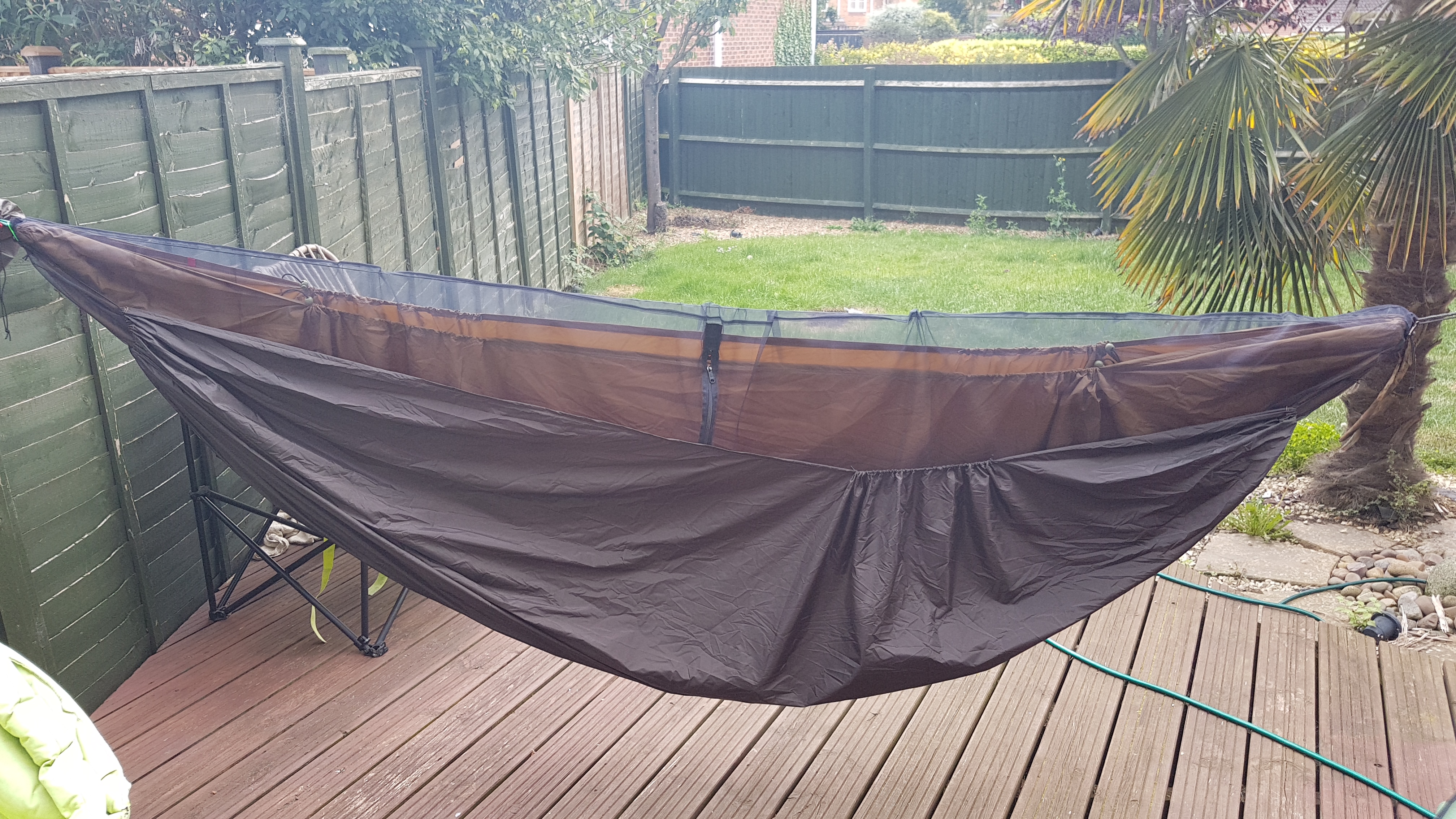 Simply did a small hem along the sides and a 5" one on each end. Then added a fixed ridgeline (@83% of hammock length), 4 knotty mods and continuous loops at ends. Added the bug net. The UQ protector is just 3yds of 1.1 oz ripstop nylon with a basic hem all round, small knotty mod each side to reduce flapping and shock cord suspension each end.